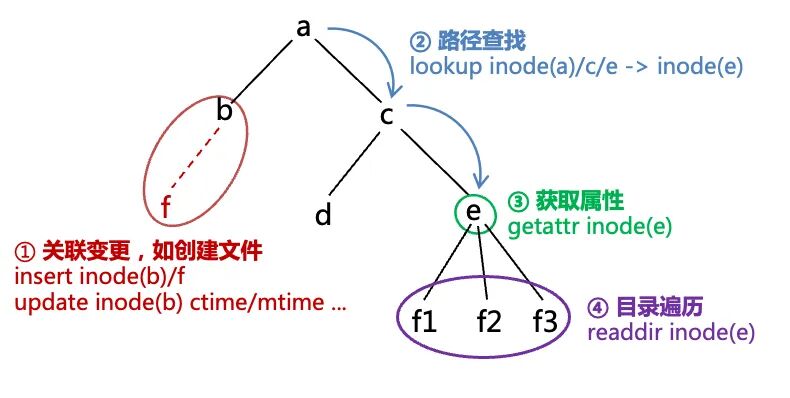 路径查找:用于一级一级找到对应目录项,单个 lookup 路径查找操作的输入是父目录 inode + 子项的名称,返回值是目录项的 inode。inode 是一个文件系统中唯一标记一个目录项的编号,通常是一个 64 位整数;