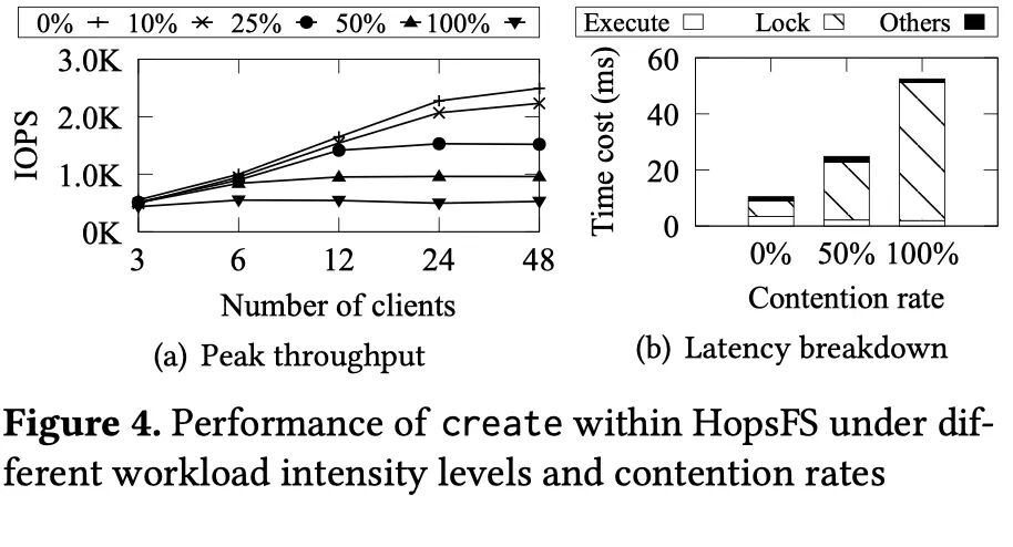 在回答了为什么元数据服务需要分布式锁之后,我们在本章节进一步展示分布式锁对写性能的影响。这里直接引用论文里对 HopsFS 创建文件操作做的定量分析,分析结果同样适用于其它系统。