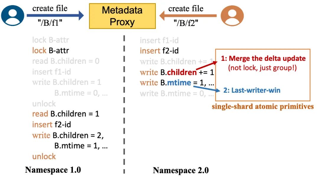 Namepace 2.0 的指导思路是不断缩小写操作的临界区范围并最终实现无锁化。 上图给了一个简单的示意图,在 Namespace 1.0 中通过锁保护的关联变更,在 Namespace 2.0 仅通过原子操作就满足,并发的操作不再需要串行执行。