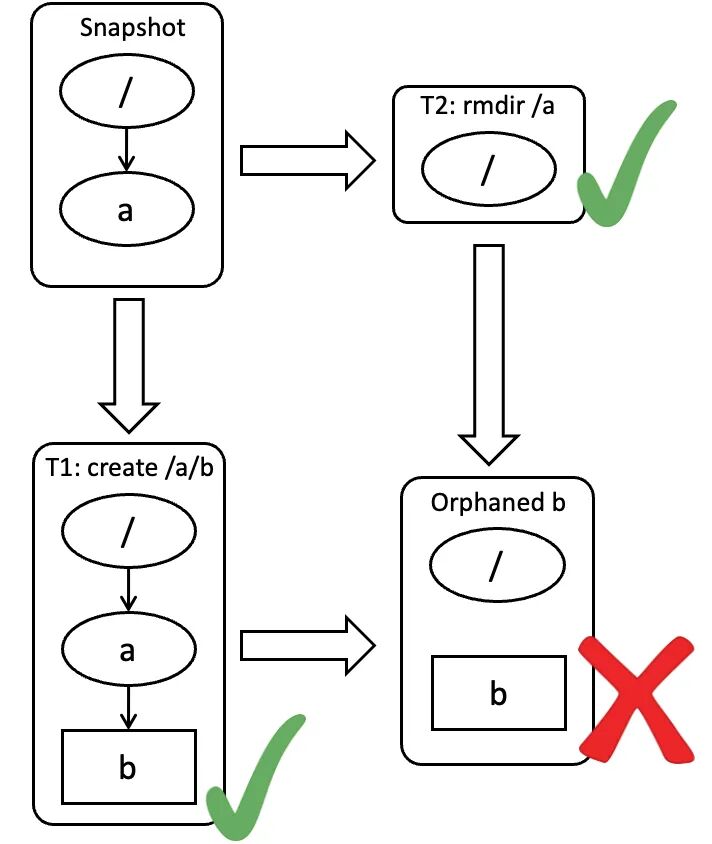 一方面,关系到元数据的一致性。例如,删除目录的时候需要判断目录是否非空,这在很多系统里会维护一个字段来记录,如果这个字段的信息滞后了,就有误判的可能性。当一个非空目录被误判为空目录,目录本身会被删除,目录下的子项残留了下来。这些残留的子项是所谓的孤儿节点,无法通过路径查找访问到;