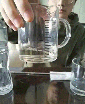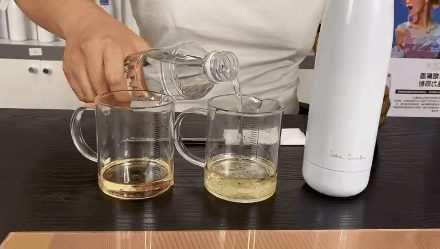 在杯中分别入等量清水和J&S活性水,滴入同等剂量的伏碘。