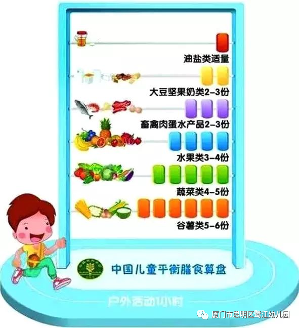 身体的生长发育需要糖类、脂肪、蛋白质、维生素、矿物质、膳食纤维和水这七种营养素。膳食搭配要注重食物的多样化和比例合理。我们国家制作了“儿童平衡膳食算盘”。算盘分六层,从下往上依次为:谷薯类、蔬菜类、水果类、鱼禽肉蛋水产品类、大豆坚果奶类、油盐类。算盘通过算珠的颜色和个数,从下往上依次表示每天各类食物的摄入量。