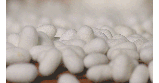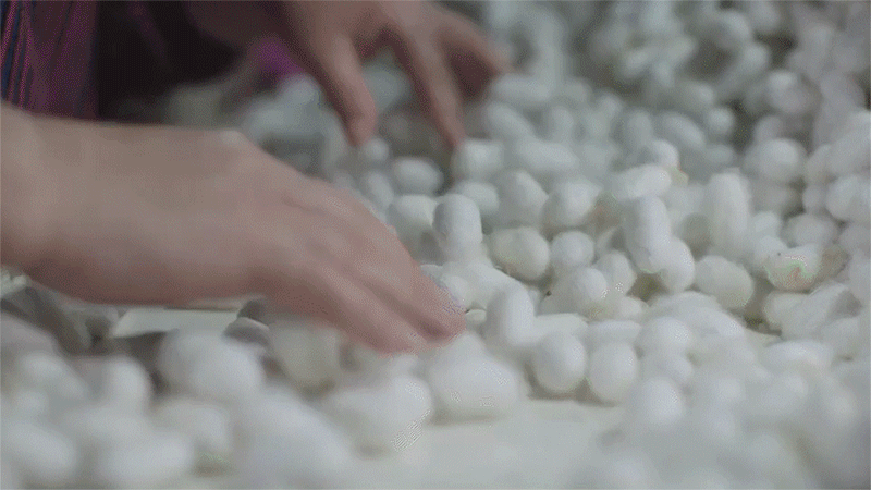 先人工挑选收集起来的蚕茧,只要双宫茧,去除品相不好的,瑕疵不洁白的蚕茧。