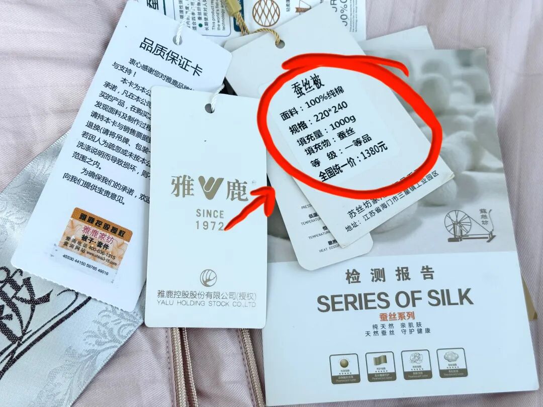 咱们这条雅鹿的蚕丝被,吊牌上自带检测报告,写明了>99.99%桑蚕丝,填充物重量多少克,长丝绵,很让人放心!!