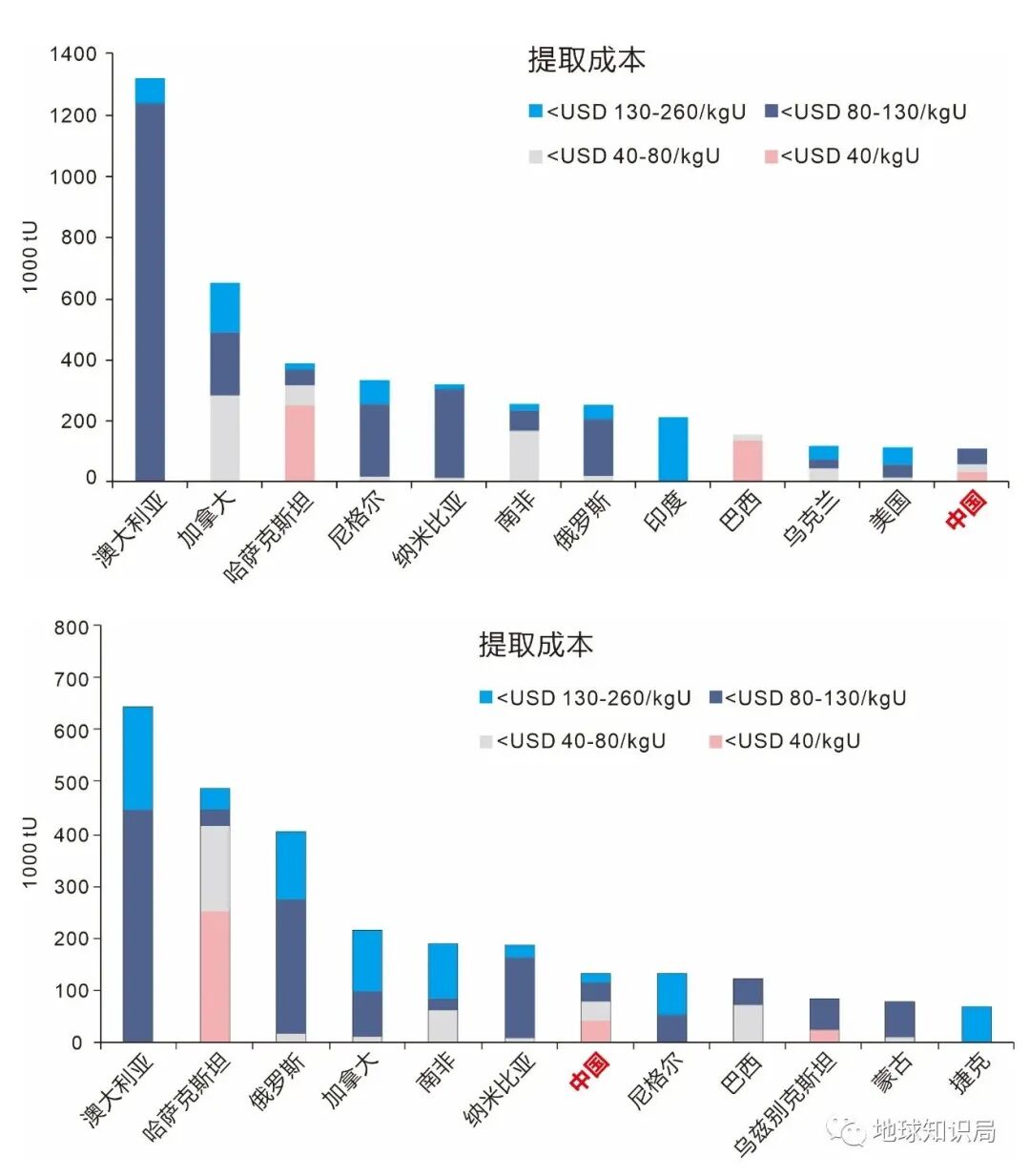 成本在40-80美元甚至更低的属于低开采成本铀矿,哈萨克斯坦(40.51%)、加拿大(17.16 %)、巴西(11.90 %)加起来占了三分之二。中国的铀资源也以这种为主。