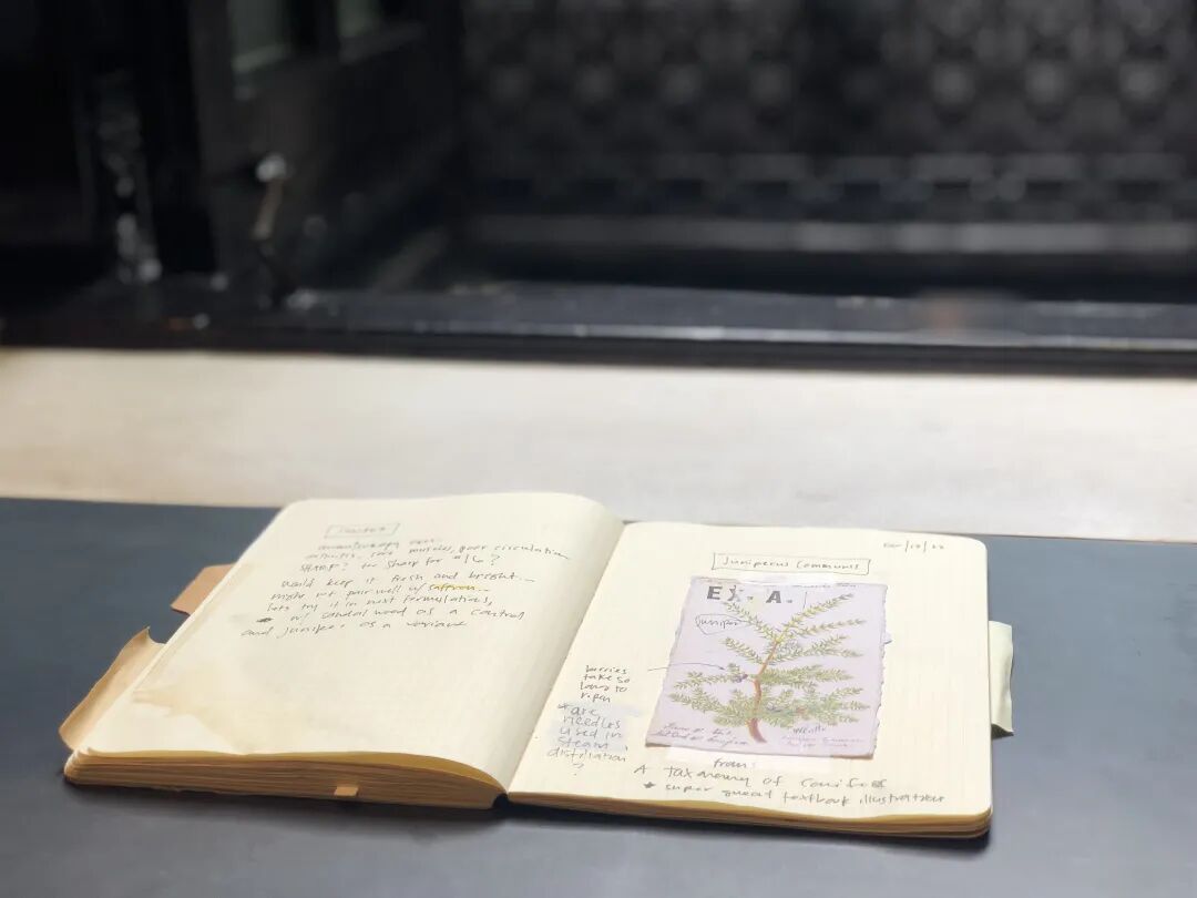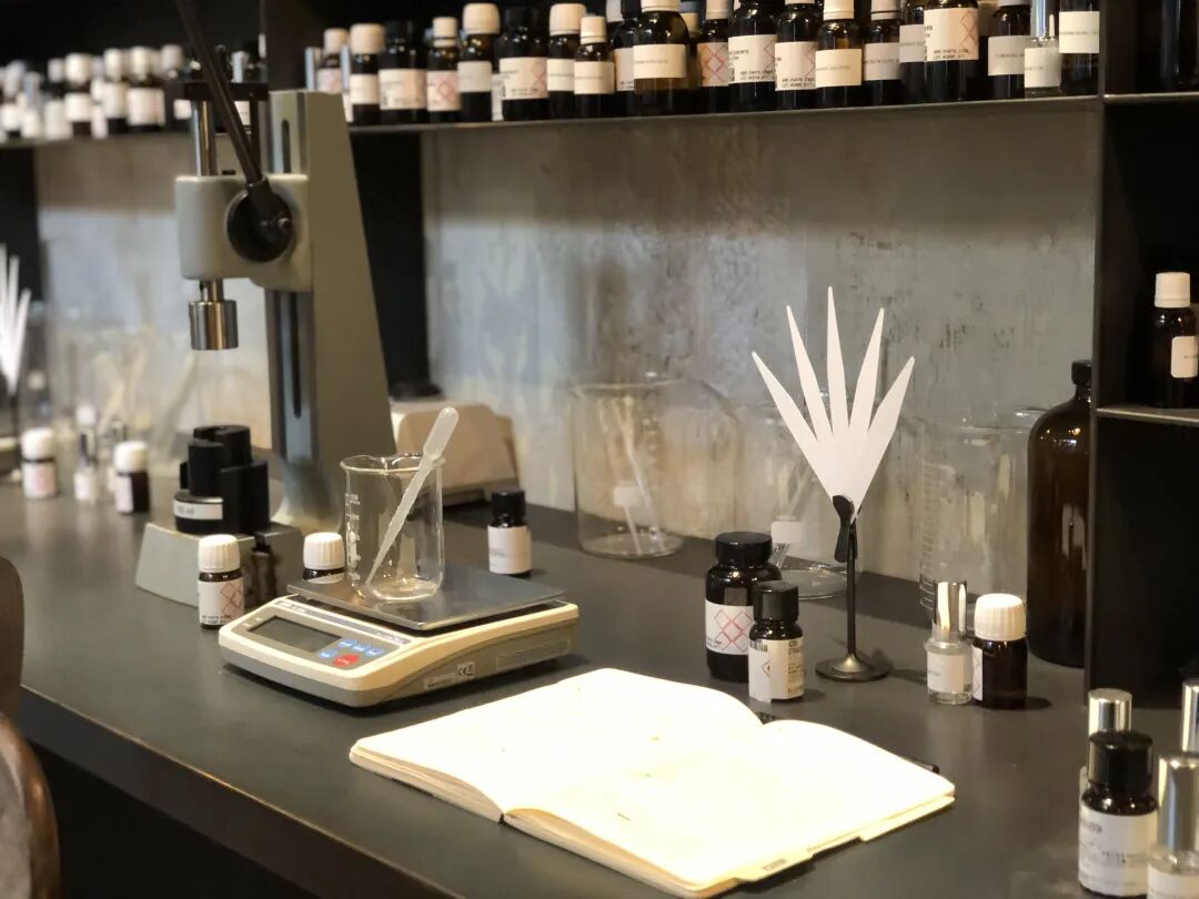 不过,若是想要在国内买到这样一瓶现场灌装的香水暂时还无法实现。也许是为了弥补遗憾,在门店二楼的调香师工作台,人们可以看到调香师工作的场景—— 架子上密密麻麻陈列贴着标签玻璃瓶,桌面上摆放着的秤盘、滴管、量杯、香精油、香料笔记本,摊开的一页上模仿调香师的笔记写满了配比公式。店员介绍说购买香水可以定制中文标签,长度在23个英文字符内即可。
