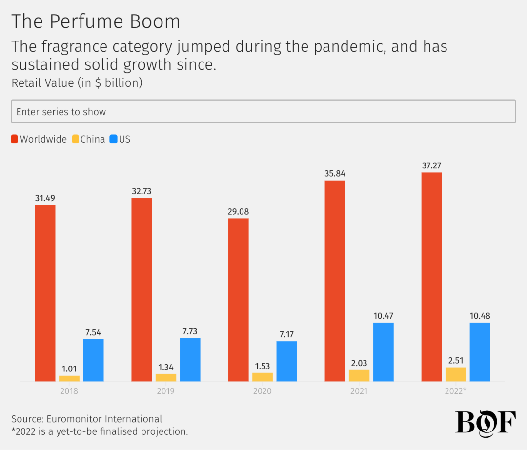 与此同时,香氛业务成了巨头们的新增长引擎。Euromonitor数据显示,包括中美在内的全球香水市场都在疫情之后维持了稳态的增长,尤其是区别于大牌香水(Designer Fragrance)的小众沙龙香(Niche Fragrance)增长势头迅猛。