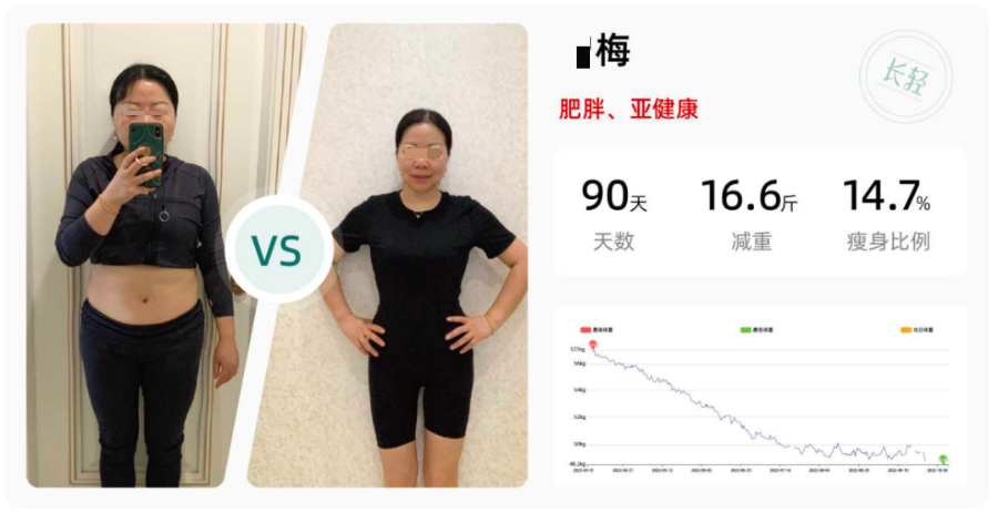 偶然的机会,接触到长轻并被长轻科学健康的理念所吸引。在老师和白同学共同努力下,体重成功下降 20 斤,身体状况和精神状态明显改善。
