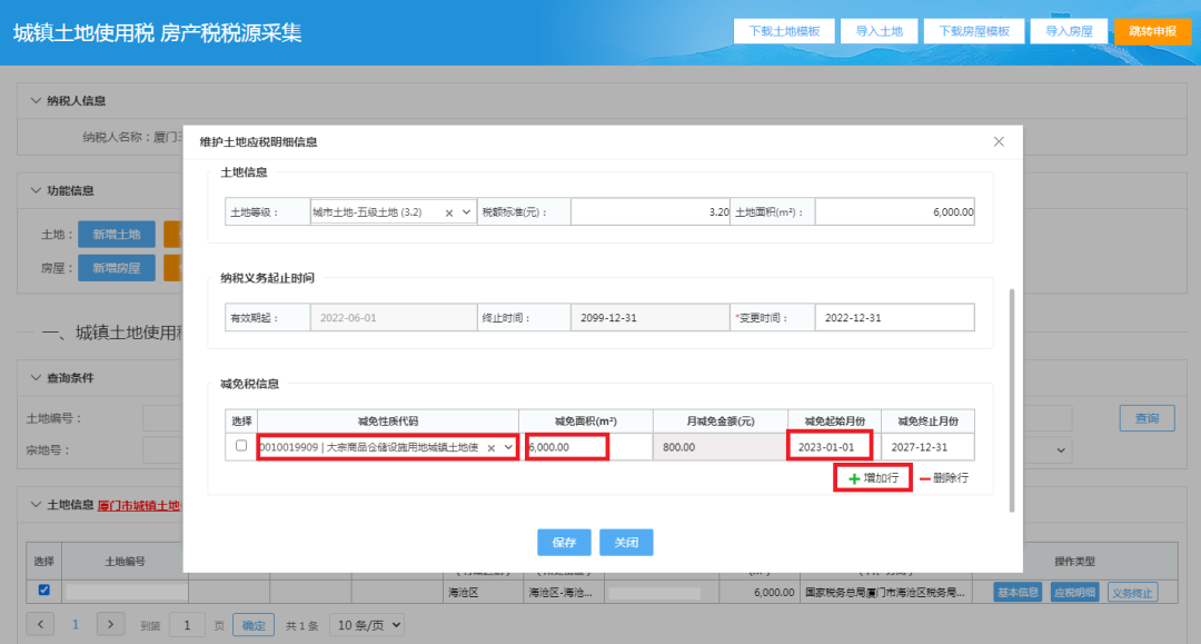 点击税源信息变更,在减免税信息项下增加行,输入减免性质代码(10019909),填入减免面积及减免起始月份,变更时间应选择“减免起始月份”前一个月的任意一天。