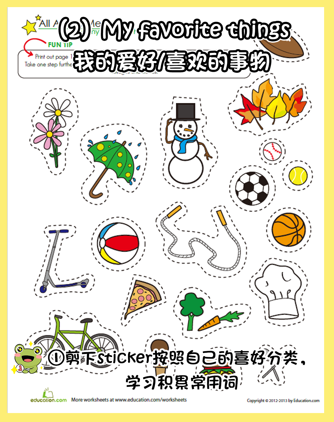 可以剪下sticker按照自己的喜好分类,学习积累常用词。如:guitar吉他、computer电脑、plant植物、hamburger汉堡、basketball篮球等 。