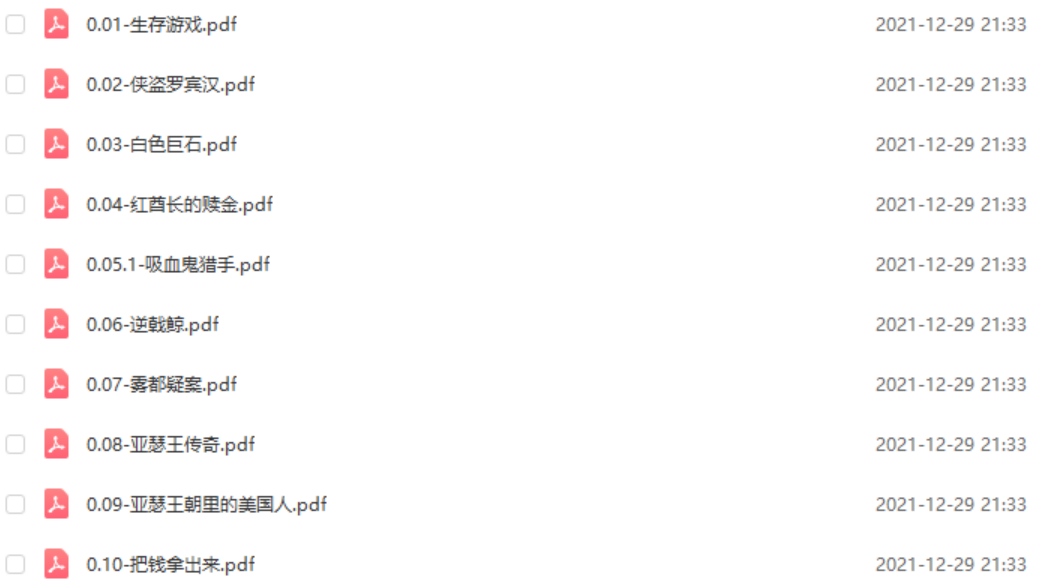 1级上目录:300生词量,适合小学、初一、初二学生02.苏格兰玛丽女王.Mary Queen Of Scots04.潘德尔的巫师.The Witches Of Pendle05.歌剧院的幽灵.The Phantom Of The Opera08.世界上最冷的地方.The Coldest Place On Earth09.阿拉丁和神灯.Aladdin And The Enchanted Lamp10.别了,好莱坞先生.Goodbye Mr Hollywood02.邦蒂号暴动.Mutiny On The Bounty03.奥米茄文件.The Omega Files Short Stories04.谁谋杀了总统.The President's Murderer05.福尔摩斯和公爵的儿子.Sherlock Holmes And The Duke's Son08.难忘米兰达.Remenber Miranda09.福尔摩斯与赛马.Sherlock Holmes And The Sport Of Kings10.汤姆·索亚历险记.The Adventures Of Tom Sawyer01.威廉·莎士比亚.William Shakespeare04.莫尔格街凶杀案.The Murders In The Rue Morgue05.鲁宾孙漂游记.The Life and Strange Surprising Adventures of Robinso Crusoe06.爱丽丝漫游奇境记.Alice's Adventures In Wonderland07.格林·盖布尔斯的安妮.Anne Of Green Gables08.五个孩子和沙精.Five Children And It10.长池村的故事.Tales From Longpuddle11.欧·亨利短篇小说集.O.Henry's Short Stories12.分享年.The Year Of Sharing01.神秘女人——阿加莎·克里斯蒂.Agatha Christie,Woman Of Mystery03.亨利八世和他的六位妻子.Henry VIII And His Six Wives04.哈克贝利·费恩历险记.Huckleberry Finn05.阿利格拉之谜.The Mystery Of Allegra06.五镇故事.Stories From The Five Towns07.法兰克福的耳环.Ear-Rings From Frankfurt09.新森林的孩子们.The Children Of The New Forest10.福尔摩斯探案故事.Sherlock Holmes Short Stories11.一个国王的爱情故事.The Love Of a King13.坎特维尔幽灵.Tha Ganterville Ghost02.野性的呼唤.The Call Of The Wild03.秘密花园.The Secret Garden04.曾达的囚徒.The Prisoner Of Zenda05.爱丽丝镜中世界奇遇记.Through the Looking-Glass06.风语河岸柳.The Wind In The Willows07.神秘及幻想故事集.Tales Of Mystery And Imagination08.铁路少年.The Railway Children09.三个陌生人.The Three Strangers And Other Stories01.圣诞欢歌.A Christmas Carol02.多里安·格雷的画像.The Picture Of Dorian Gray03.勃朗特一家的故事.The Bronte Story01.巴斯克维尔猎犬 the.hound.of.the.baskervilles02.不平静的坟墓.the.unquiet.grave03.三怪客泛舟记.three.men.in.a.boat04.三十九级台阶.the.thirty-nine.steps09.化身博士.dr.jekyll.and.mr.hyde01.双城记.A Tale of Two Ctities02.格列佛游记.Gulliver's Travels06.极限之旅.Desert Mountain Sea01.大卫·科波菲尔.David Copperfield02.远离尘嚣.Far From The Madding Crowd03.远大前程.Great Expectations04.呼啸山庄.Wuthering Heights05.园会.The Garden Party And Other Stories06.理智与情感.Sense And Sensibility6级目录:2300生词量,适合高三、大学低年级学生03.傲慢与偏见.Pride and Prejudice04.苔丝.Tess of The D'Urbervilles05.白衣女人.The Woman in White全英文电子文本,入门到6级共七级全套大放送,从科普到人文,从历史到天文,帮你提升阅读量!附带MP3音频格式,纯正英国伦敦口音,优雅绅士的发音苏你一身,帮你提升听力!![]()