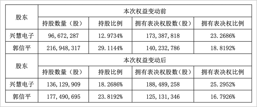 郭老板一把将旗下0.72亿股份,即9.7048%的股权转让给兴慧电子,同时将持有的10.2952%表决权委托给后者。
