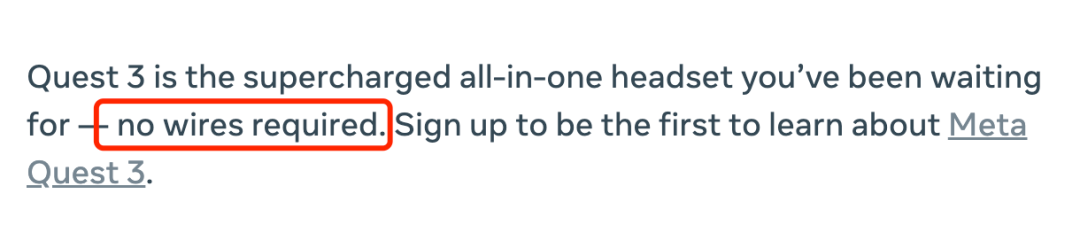 我们还在官方新闻中找到一些比较有趣的句子,看到了Meta和苹果之间若有若无的火药味。比如说,Meta特定用破折号表示的“无线”和一体机设计以及强调为未来的头显设立新的标杆等。