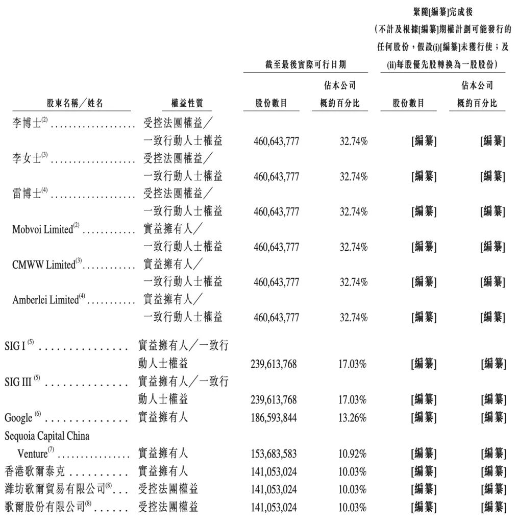 此外,持股比例10%以上的股东为SIG(海纳亚洲创投基金)持股17.03%,谷歌持有13.26%,红杉资本持股10.92%,歌尔股份通过香港歌尔泰克持股10.03%。![]()