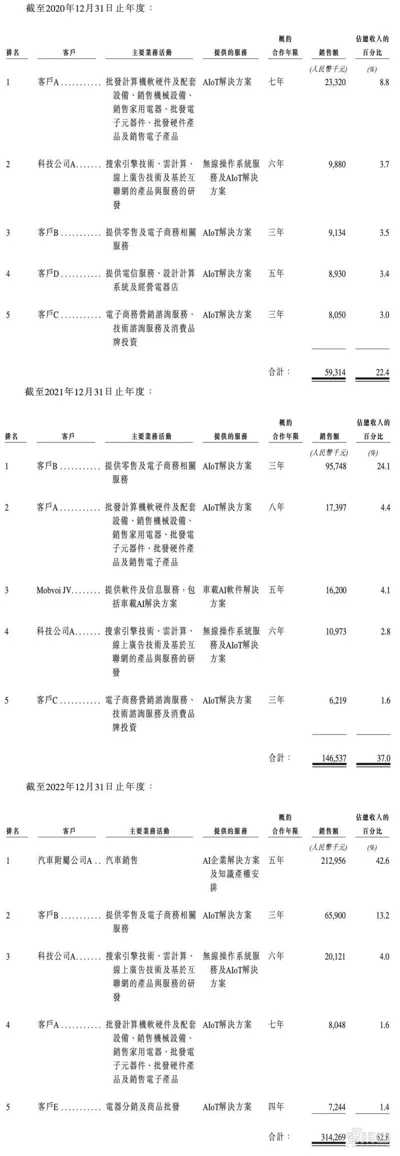 招股书显示,出门问问的客户主要包括购买AIGC解决方案的内容创作者、购买AI企业解决方案的企业、购买AIoT智能设备的消费者以及AIoT设备的线上和线下分销商。2020年至2022年,出门问问来自前五大客户的收入分别占总收入的22.4%、37%、62.8%,其中来自最大客户的收入占总收入的8.8%、24.1%、42.6%。2020年、2021年出门问问为最大客户提供的是AIoT解决方案,2022年为AI企业解决方案及知识产权安排。![]()