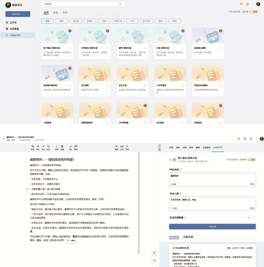 去年9月出门问问发布的AI写作助手魔撰写作,支持文案编辑和校对。基于其通用大模型能力,用户将关键字输入就可以生成完整的段落或文章,并且还能对文字进行智能纠错、润色等。![]()