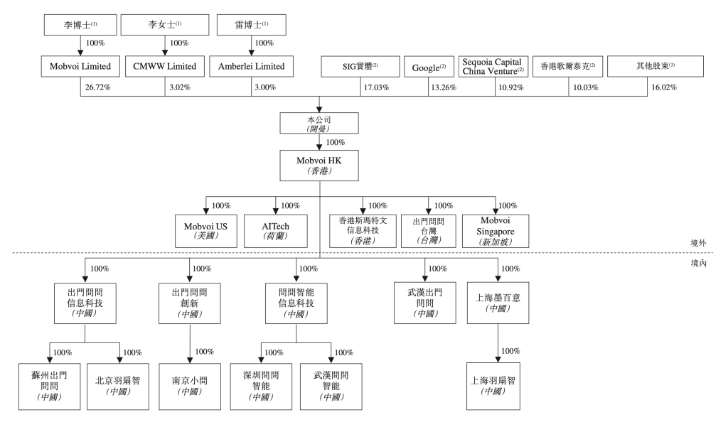 出门问问创始人、董事长、CEO李志飞通过Mobvoi Limited持股26.72%,出门问问联合创始人、执行董事兼首席运营官李媛媛通过CMWW Limited持股3.02%,出门问问CTO雷欣持股比例为3%,并且李志飞、李媛媛、雷欣为一致行动人,因此合计持有32.74%股份。![]()
