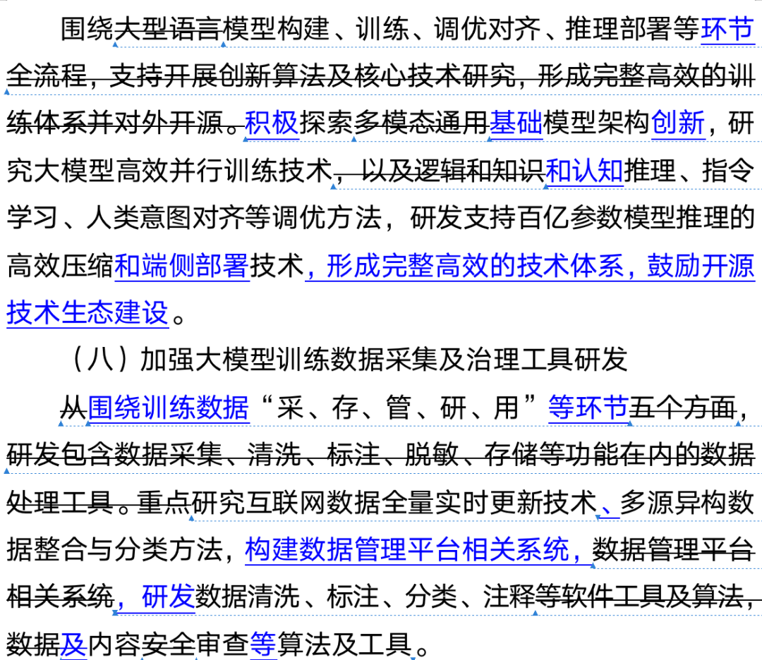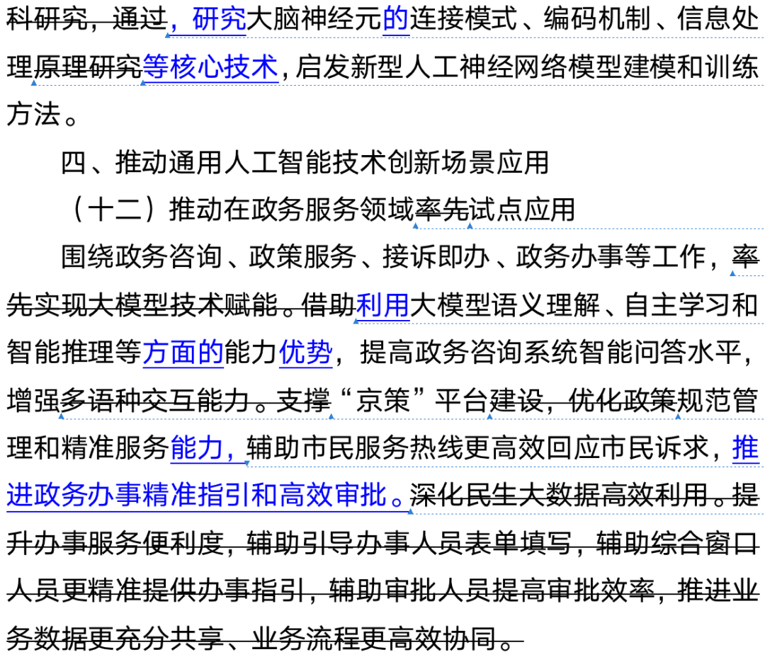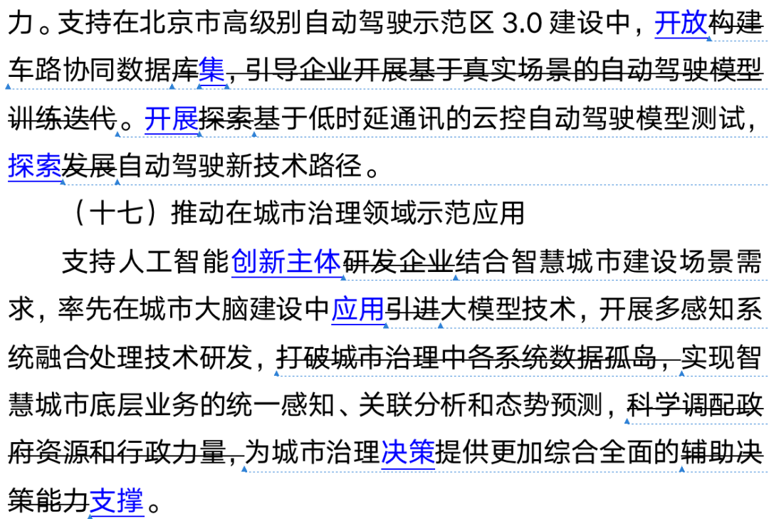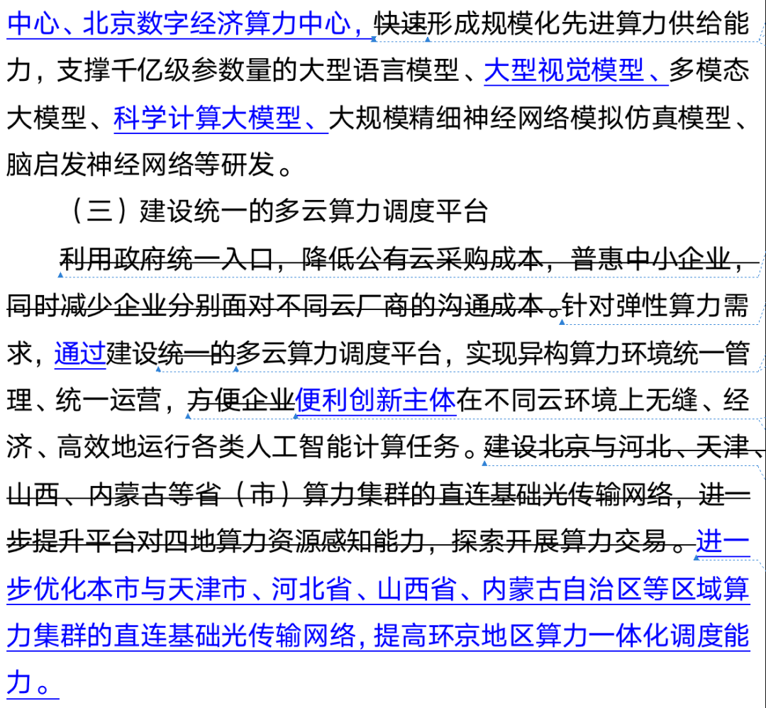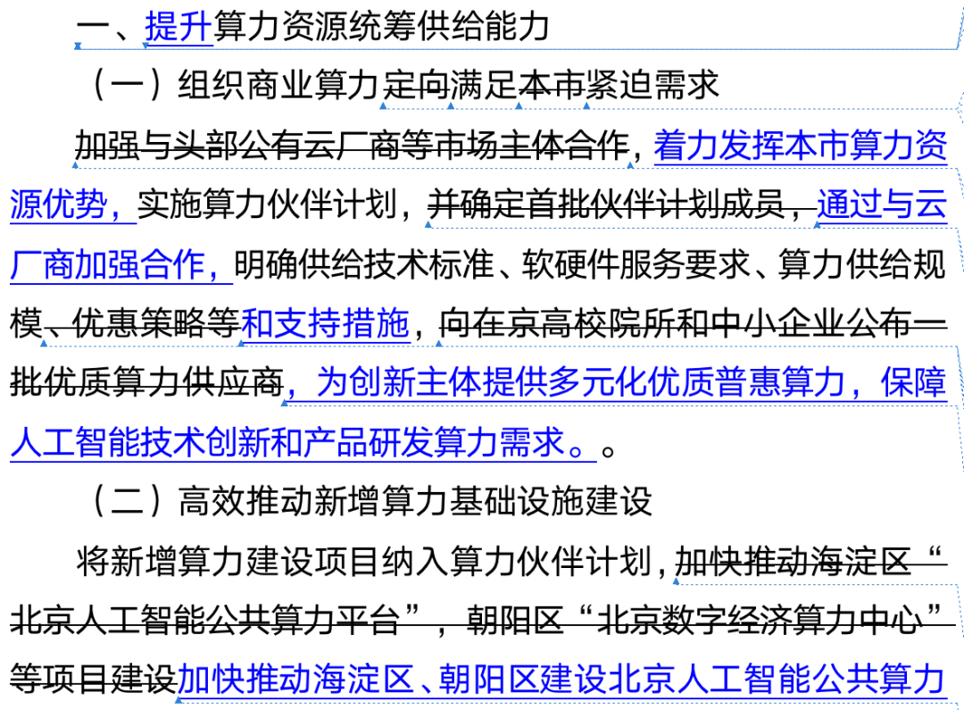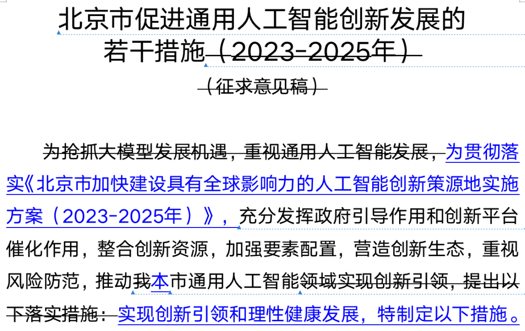 相比于征求意见稿,虽然新版措施整体方向变化不大,但这二十一条举措的具体阐述内容发生了近80%篇幅的重大改动,涉及关键举措变化、专业术语优化、实时情况更新、内容简化等多项修改。比如:此前广受讨论的表述“加强与头部公有云厂商等市场主体合作”,替换为了“与云厂商加强合作”;“利用政府统一入口”以及多处“率先”、“国家级”这样的措辞被调整;“方便企业”这样的字眼被优化为“便利创新主体”等,这些修改释放出众多信息干货。这些变化体现了其对行动和责任主体、措施覆盖面和边界、执行节奏等各方面的反复斟酌考虑,是过去几周广泛结合产学研各界意见之后的成果。由于通用人工智能产业发展在全球缺乏参考路径,北京的举措“说什么和不说什么”对产业参考意义极大。智东西将措施修改前后版本对比呈现,以通过还原修改历程为产业提供全面参考。新旧版措施对比见文章第二部分。![]()