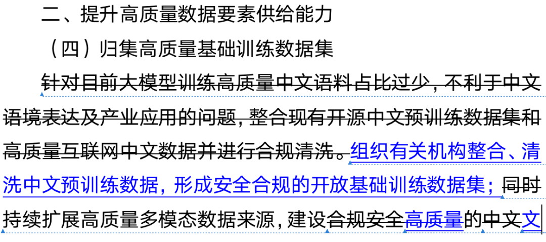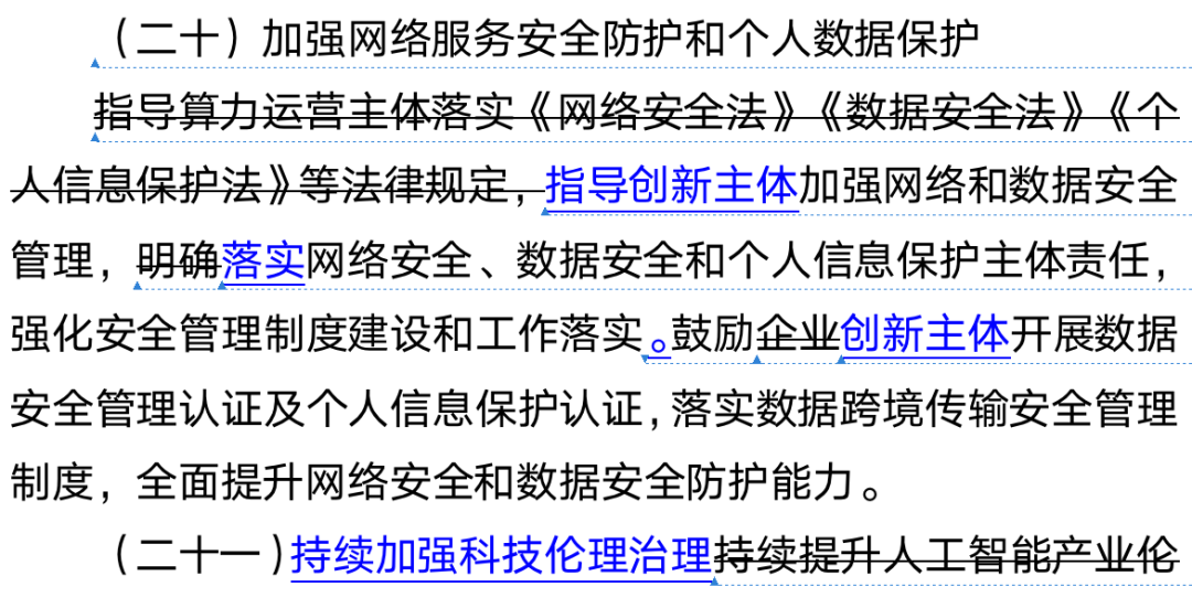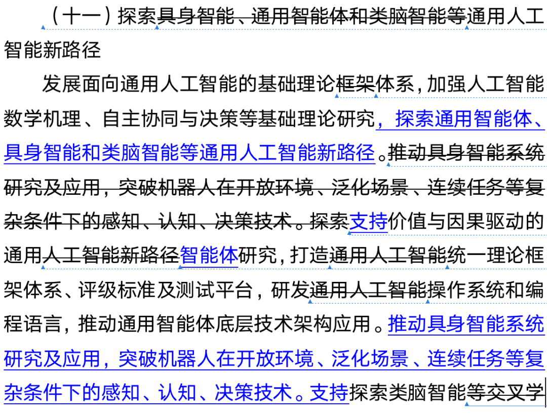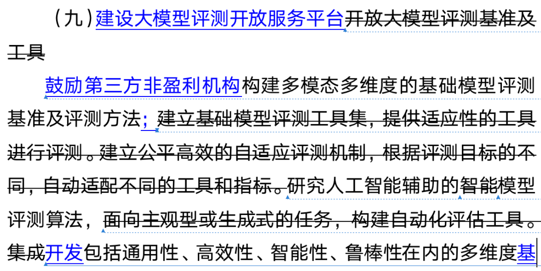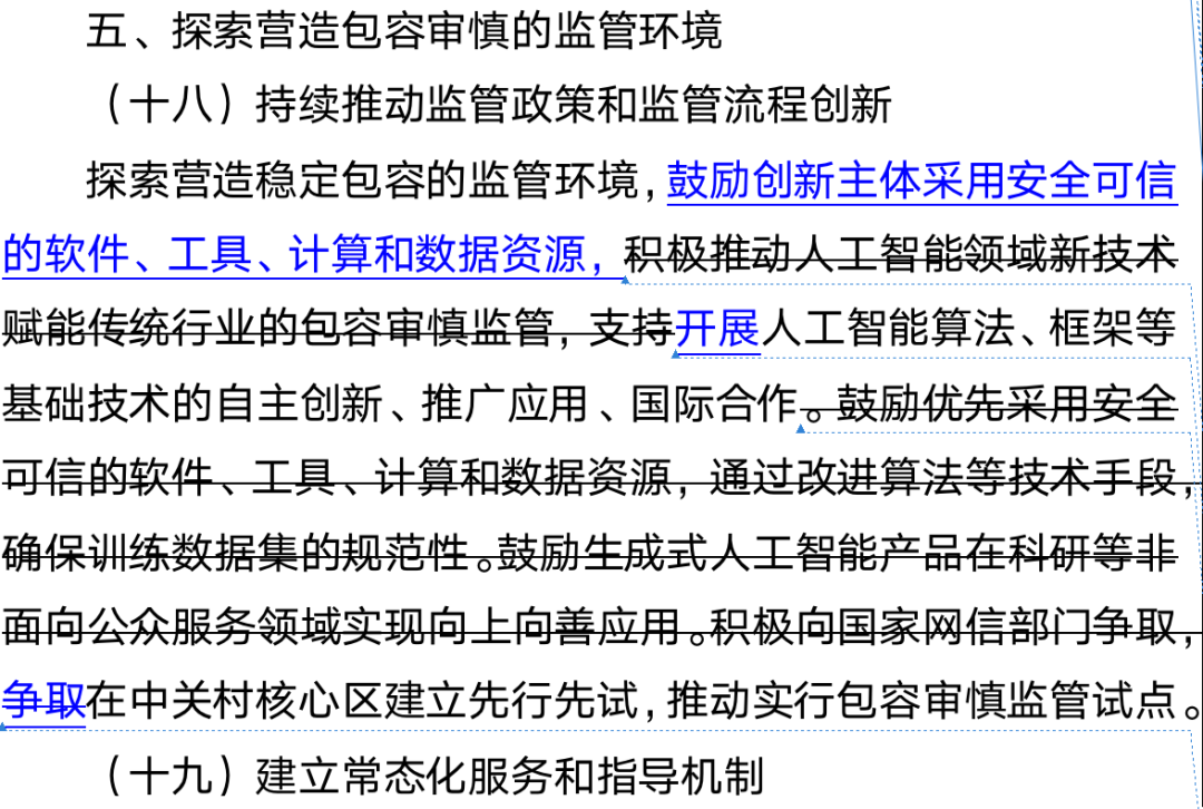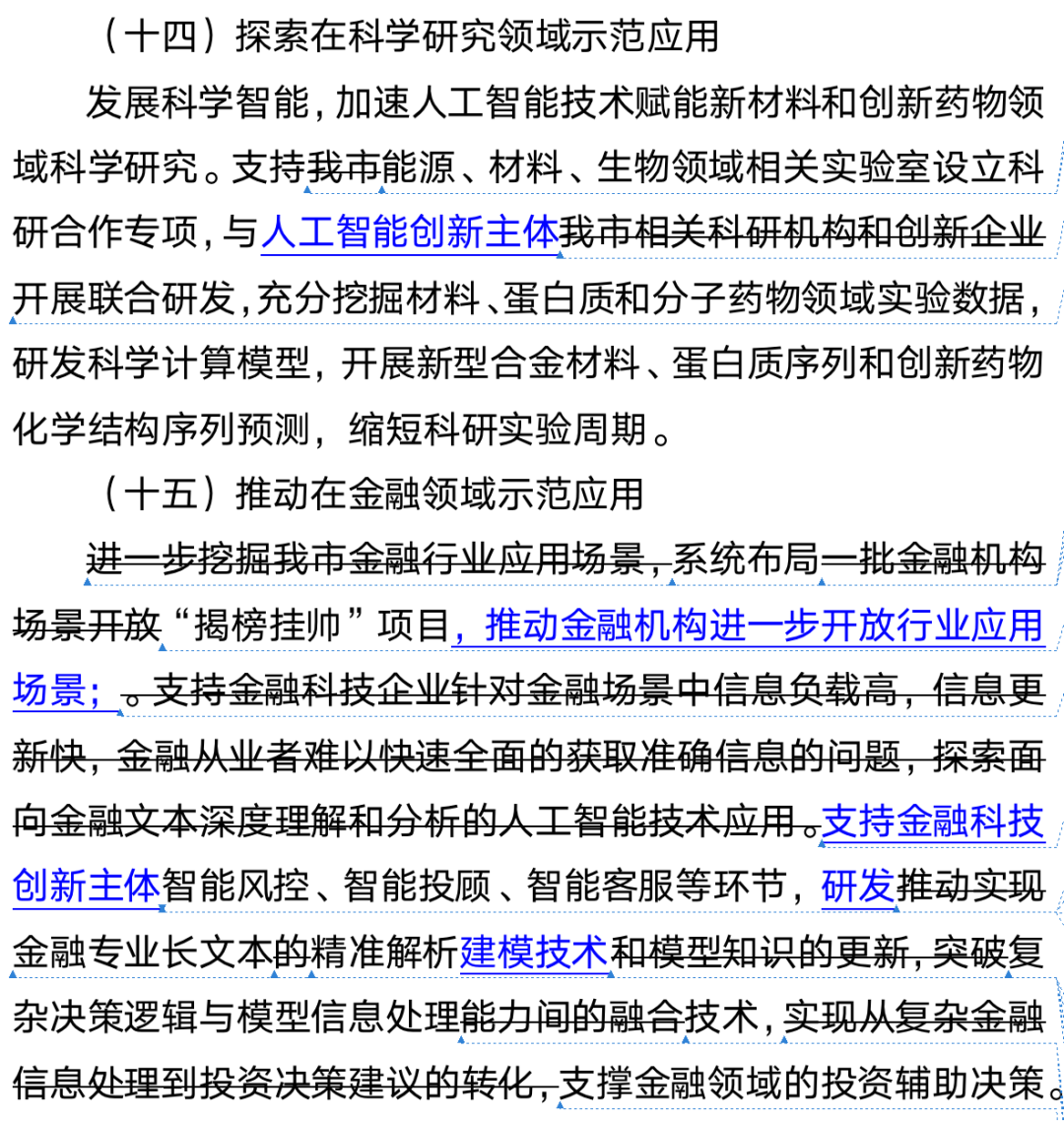 相比于征求意见稿,虽然新版措施整体方向变化不大,但这二十一条举措的具体阐述内容发生了近80%篇幅的重大改动,涉及关键举措变化、专业术语优化、实时情况更新、内容简化等多项修改。比如:此前广受讨论的表述“加强与头部公有云厂商等市场主体合作”,替换为了“与云厂商加强合作”;“利用政府统一入口”以及多处“率先”、“国家级”这样的措辞被调整;“方便企业”这样的字眼被优化为“便利创新主体”等,这些修改释放出众多信息干货。这些变化体现了其对行动和责任主体、措施覆盖面和边界、执行节奏等各方面的反复斟酌考虑,是过去几周广泛结合产学研各界意见之后的成果。由于通用人工智能产业发展在全球缺乏参考路径,北京的举措“说什么和不说什么”对产业参考意义极大。智东西将措施修改前后版本对比呈现,以通过还原修改历程为产业提供全面参考。新旧版措施对比见文章第二部分。![]()