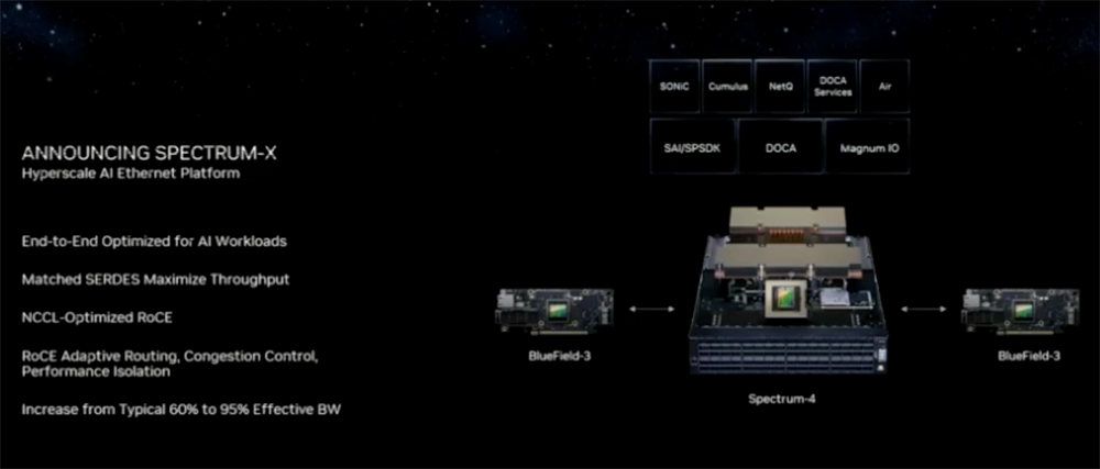 黄仁勋还宣布推出NVIDIA Spectrum-X,这是一个旨在提高基于以太网的AI云的性能和效率的网络平台。![]()