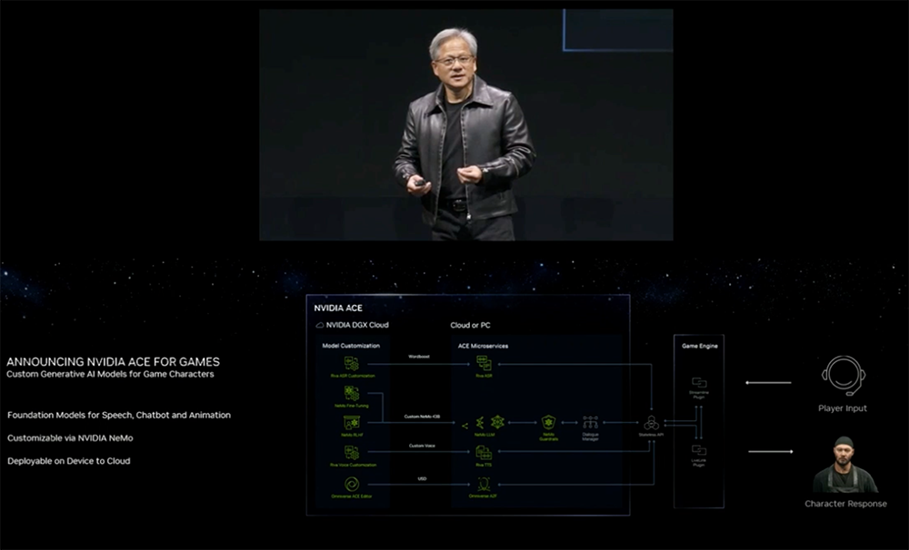 生成式AI将改变玩家与游戏角色间的互动方式,并极大提高游戏的沉浸感。对此,黄仁勋宣布推出面向游戏的NVIDIA Avatar云引擎(ACE)。![]()