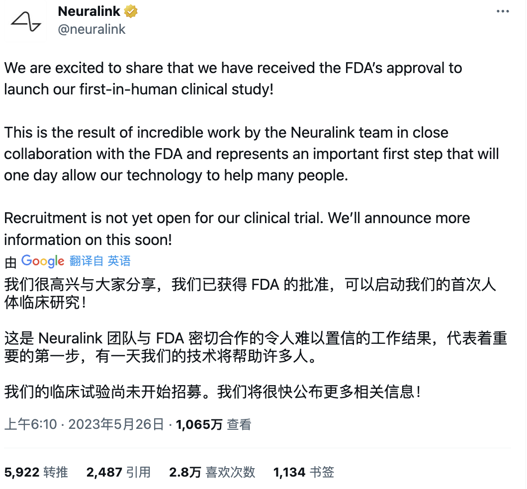就在今天,Neuralink宣布其获得FDA的批准,Neuralink的人体临床研究终于开始按照马斯克的计划表向前推进。