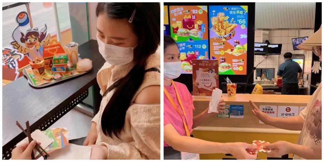 在线上,个性鲜明的“四小福”重出江湖啦!扫餐盘垫上的小程序码,可以和朋友一起玩耍棋盘机制,也可以在社交媒体上向大家宣布“有麦乐鸡,我就是小朋友!”