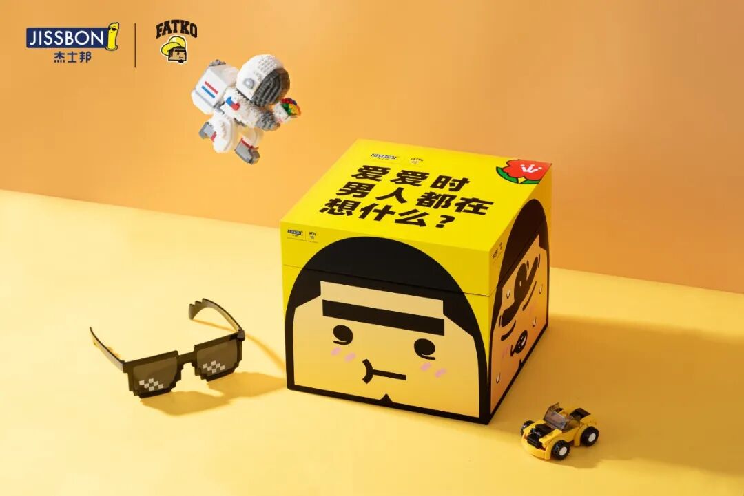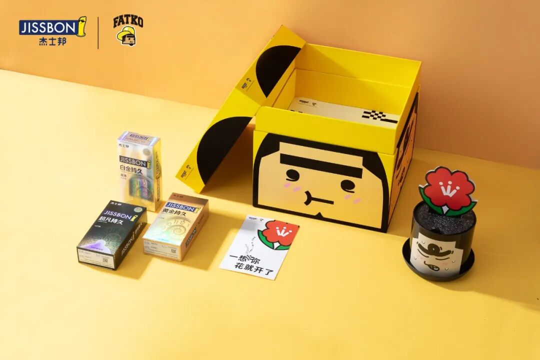 说起跨界营销,杰士邦每年都会给我们带来惊喜。今年的杰士邦与“NBA中国指定合作潮流IP”FATKO合作,延续#爱爱时,男人都在想什么#的话题,推出了限定联名礼盒。FATKO是创始人NIKOKO在2006年创立,从最初的一张自画像延伸出包括艺术品雕塑、搪胶公仔、服装服饰和生活配件等产品的综合潮流IP。此次的联名礼盒在设计上做成了一款黄色百宝箱,产品组合包含了与话题相关的持久系列产品:黄金持久+超凡持久+白金持久各十个,还有一个颇具创意性的“定制花盆”。随机种子+亲自栽种增添了礼盒趣味性,不同的种子对应着TVC中男生爱爱时所想的各种画面,再次强调了话题和核心输出。![]()