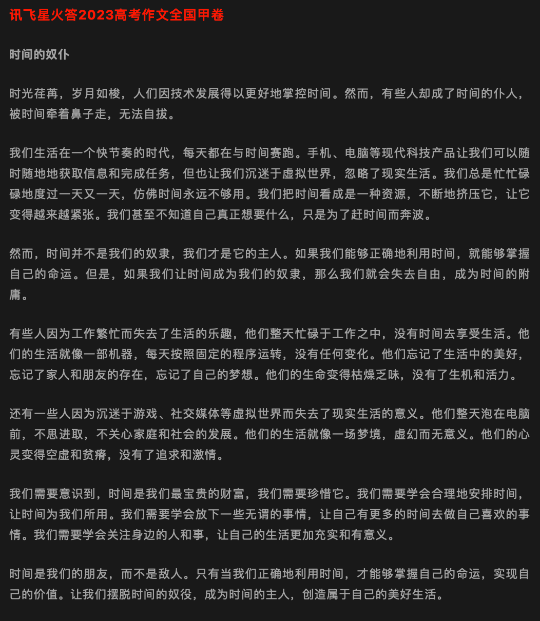 综合上述各家大模型平台对该篇作文的论述,可以看出只有ChatGPT完整充分地切题,对科技与时间的关系进行探讨。而其他家在表述过程中逐渐偏题,一味讨论如何把握人与时间的关系,做时间的主人,而忽视科技在本题中的重要性。