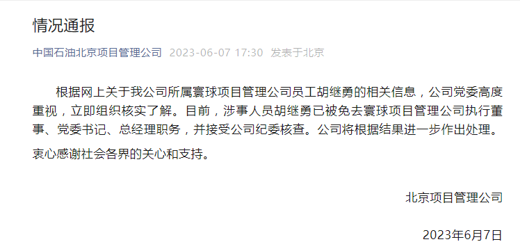 根据网上关于我公司所属寰球项目管理公司员工胡继勇的相关信息,公司党委高度重视,立即组织核实了解。目前,涉事人员胡继勇已被免去寰球项目管理公司执行董事、党委书记、总经理职务,并接受公司纪委核查。公司将根据结果进一步作出处理。衷心感谢社会各界的关心和支持。