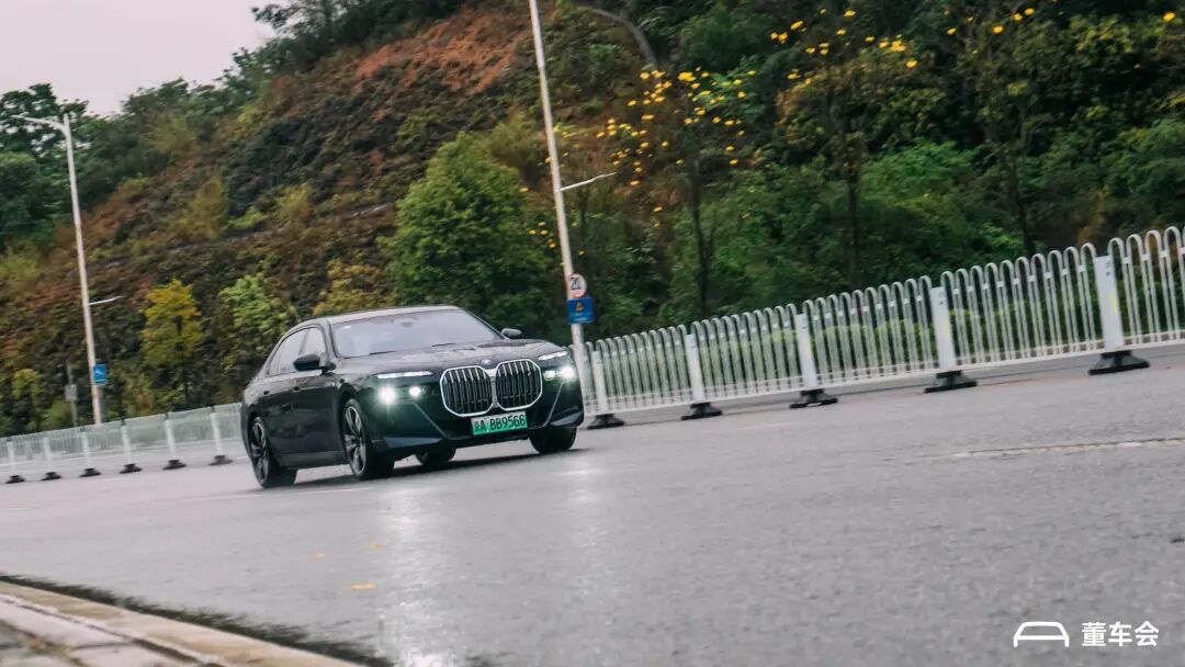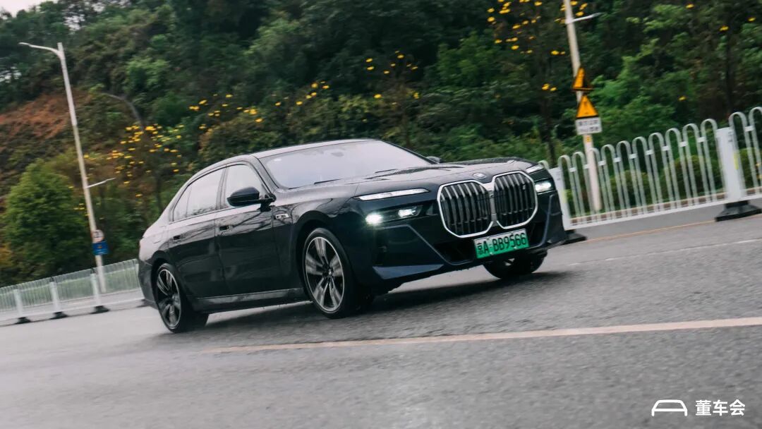 「舒缓模式」很好理解,靠背躺下去,腿托升起来,关闭遮阳帘,再为你打开按摩,在这一级别的行政轿车上也算是基本操作了。i7 真正的重头戏,是头顶上这块分辨率高达 8K 的 31 英寸显示屏。这块 32:9 的 BMW 悬浮式巨幕巧妙地集成在了顶棚系统中,进入「影院模式」便会自动展开,另外也可以在扶手触控屏中将其调出。从内置的爱奇艺、华为应用商店这些国内头部生态应用来看,宝马确实下定决心要为中国用户带来一套完善的娱乐系统,而并非像某些豪华车企那样支持 HDMI 就草草了事。在扶手屏按下「躺倒键」后,副驾座椅会自动靠到最前,这时它大概率会对右后视镜造成遮挡(视驾驶员具体坐姿),需要手动往后移动一下。另外,后排屏幕,展开后,你的后视镜里就只剩下它了。可以看到,iDrive 8 在功能上尚属全面,但其设计和交互,似乎还停留在上一个时代。你可能会在那繁杂的菜单中迷失,就像我至今仍不知道主驾按摩的开关在哪里,好在,它的语音功能还算可用。一辆售价接近 150 万元的行政轿车,它的充电盖板竟然还要在车外手动开启,雨后满是尘土的叶子板,我实在是不太想摸。在后排介绍完「舒缓模式」和「影院模式」,最后的篇幅,应该留给我最喜欢的部分「运动模式」。比起坐,这辆 i7 一定更适合开,而且是长期放在运动模式开。开启运动模式后,环抱式光带会变成红蓝双色,仪表盘也要更为「战斗」,瞬间收紧的座椅也为弯道做好了准备。i7 配备了首次应用于 BMW 车型的主动舒适防倾功能,在弯中会主动调整车辆一侧的车身高度,操控更加平稳。想象一下,你现在坐着一辆速度很快的火车,在一个圆形的轨道里绕圈,虽然你的身体会靠向一边,但只要火车不脱轨,它永远都会处于近似水平的状态。开着这辆重达 2.7 吨的 i7 去劈弯,只要你不突破轮胎的极限,差不多就是这种感觉。但重头戏还是在直线。来,看一眼这个拨片,它是用来开启快乐的。按下它,你就能够获得前后两台励磁同步电机全部的 536 马力以及 745 牛米的扭矩,赋予这辆 2.7 吨「大块头」4.7 秒的零百加速成绩。好消息是,10 秒过后你还可以继续按,直到你把 560km 的续航里程全部耗光。还记得在 EQS 的发布会上,梅赛德斯多次强调,EQS 不是 S 级的纯电版。从价格来看,EQS 580 4MATIC 也不过 130 万元,而 S 500 L 4MATIC 指导价则在 180 万元以上。但宝马就不一样了,即便是顶配的 740Li,都比 i7 差了一辆 2 系。对于宝马来说,i7 是 BMW 品牌将纯电驱动系统放到旗舰系列的首次尝试。是的,和 EQS 不同,这是真正的旗舰。宝马希望通过 i7 来定义纯电时代的新豪华,更希望这辆 i7 能够带领整个宝马集团加速驶向电动化的未来。