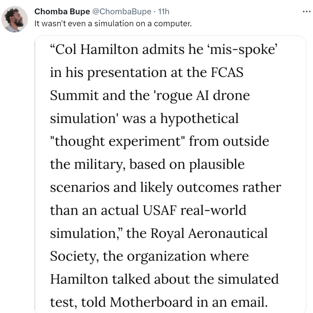 USAF Official Says He ‘Misspoke’ About AI Drone Killing Human Operator in Simulated Test(VICE)