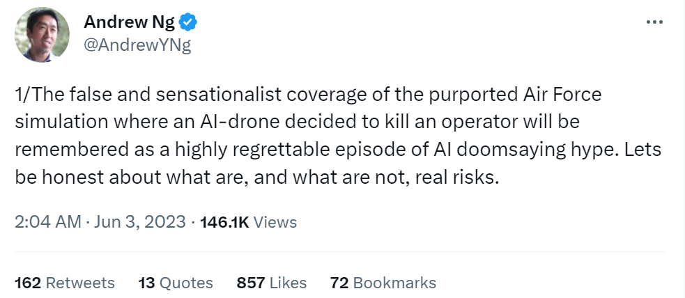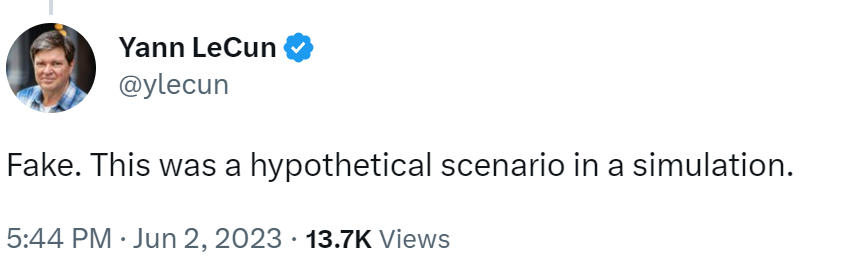 在一份声明中,空军发言人 Ann Stefanek 也否认进行了任何模拟,他表示:「美国空军部没有进行任何此类 AI 无人机模拟,并将继续致力于以合乎道德和负责任的方式使用 AI 技术…… 看来上校的评论是被断章取义的,这本来就是个故事。」在汉密尔顿所说的「奖励机制」对于人工智能领域而言是个再熟悉不过的概念。在强化学习中,为算法设置奖励机制可以帮助 AI 学习策略,比如在星际争霸游戏里,将胜利设为 reward=1,失败为 0。就可以先设置 0.0001 的 reward 让智能体学会采矿。达到职业玩家水平的 AlphaStar 就是依靠这种监督学习一步步实现了高水平。然而奖励机制并不意味着对 AI 设定了道德准则,有时也会导致算法做出一些匪夷所思的事。在 2021 年,狼吃羊的 AI 智障游戏成为了热搜。在这个简单的游戏里,研究人员设置狼抓到羊奖励 10 分,撞到障碍物扣 1 分,同时为了提高速度,又设置每秒钟狼受到 0.1 分惩罚。训练了 20 万次,结果 AI 控制的「狼」认为大部分情况下都无法抓到猎物,于是选择一头撞死,这样似乎才是它认为的最高收益。DeepMind 首席执行官哈萨比斯曾表示,游戏 AI 是通往通用人工智能的垫脚石,它是研究通用 AI 算法的一个非常方便的试验场。汉密尔顿的假设沿用了人们对于此前强化学习表现的观察。近年来,美国军方一直在试验人工智能在战场中的应用。2020 年,在美国国防高级研究计划局(DARPA)和约翰・霍普金斯大学举行的挑战赛中,人工智能操作的 F-16 在五次模拟空战中击败了人类对手。据《连线》杂志报道,去年年底,美国国防部与人工智能飞行员一起成功进行了 F-16 的首次真实世界试飞,人们计划在 2023 年底前研发出新型自动驾驶飞机用于作战。现代空战的胜负很大程度上取决于「观察、判断、决策、行动」的速度和准确性。传统观念认为无人机观察能力差、决策容易出错,不适合空战,只能承担侦察和轰炸等任务。但随着技术迭代速度的加快,AI 不仅速度快,判断和决策能力也有提升。最近一些技术的进步,将决定未来战斗机在多大程度上依赖人类飞行员。但最近 AI 技术的突破也引发了人们对于危险性的担忧。在 ChatGPT 推出后,OpenAI 创始人、CEO 山姆・奥特曼一直在呼吁为 AI 系统制定许可制度与安全标准。同时也在本周,包括奥特曼、哈萨比斯,以及图灵奖获得者、深度学习先驱 Geoffrey Hinton 与 Youshua Bengio 共同签署了一封公开信,整份声明只有 22 个字:「减轻 AI 带来的灭绝风险,应该与流行病和核战争等其他社会规模的风险一起,成为全球优先事项。」但在「无人机杀死操作员」的消息出现之后,另一波 AI 研究者开始了反击。一直以来,对 AI 持肯定态度的人工智能和机器学习领域最权威的学者之一吴恩达表达了自己的看法,他表示:在所谓的空军模拟中,一架人工智能无人机杀死一名操作员,这一虚假和耸人听闻的报道将被视为人工智能末日炒作又一相关事件。但是我们需要认清什么是真正的风险,什么不是。随后,吴恩达又表示:AI 开发者确实意识到了 AI 带来的诸如偏见、公平性、不准确性和职业替代等真正的风险,并正在努力解决这些问题。然而,(有些人)不切实际的炒作确实转移了人们对真正问题的关注度。这也阻碍了人们进入人工智能领域、创造更多东西帮助人类的机会。在谈到风险时,这位网友表示道:Andrew 你能澄清一下你所说的不是「真正的风险」是什么意思吗?如果人们因为听说了一个不真实的故事就认为这样的场景不可能发生,这对他们来说是好事吗?我们暂且不管这位网友的态度如何,对于此事,深度学习三巨头之一,与 Hinton、Bengio 同为 2018 年图灵奖获得者的 Yann LeCun 的态度更是直截了当:假的。这是模拟中的一个假设场景。在回复 LeCun 的推特中,这位网友表示:这一事件甚至不是在电脑上模拟的。在他推特截图下,信息显示汉密尔顿上校承认他在 FCAS 峰会上的演讲中说错了,「人工智能无人机模拟」是一个假想的「思想实验」,基于合理的场景和可能的结果,而不是美国空军真实世界模拟。在同一个星期,因为深度学习贡献获得图灵奖的 Yoshua Bengio、Geoffrey Hinton 与 Yann LeCun 不约而同地都对当前的 AI 风险发表了自己的意见,其中 Bengio 和 Hinton 表示担忧,LeCun 则对人们过分夸大风险的态度表示反感。在这一波 AI 大发展的同时,如何规范技术已经成为了近在眼前的问题。尽管这场所谓的「思想实验」是一个误会,但在军事以外的领域,依赖人工智能进行高风险任务已然导致了严重的后果。比如最近一位律师在提交给联邦法院的文件中使用了 ChatGPT,而这个聊天机器人却将一些虚构的案例作为证据,致使执业 30 年的老律师面临吊销执照的处分。在另一个例子中,一名男子在与一个鼓励他自杀的聊天机器人交谈后,结束了自己的生命。这些 AI 失控的例子表明,AI 模型远非完美,可能偏离正轨并对用户造成伤害。甚至连 OpenAI 的 CEO 山姆・奥特曼都曾表示,OpenAI 虽然研发出一些最受欢迎的 AI 模型,但不要将 AI 用于更严肃的目的。就在几天前的国会作证时,奥特曼表示,AI 可能会出现严重问题并对世界造成重大伤害。参考来源: