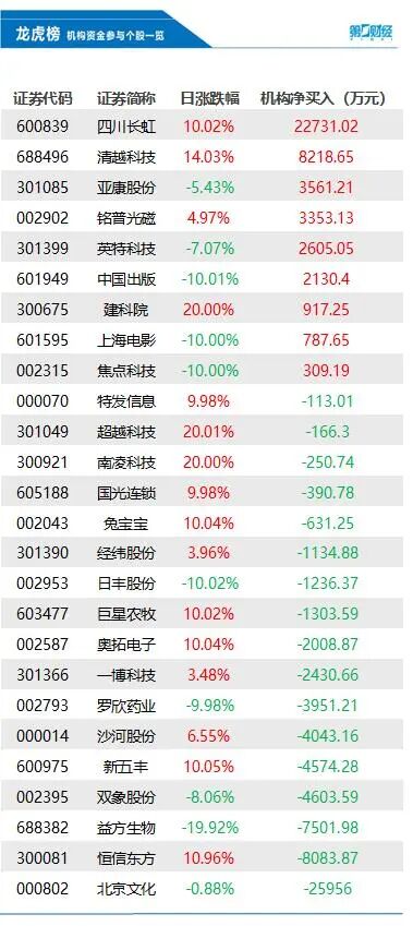 6月8日龙虎榜中,共26只个股出现了机构的身影,有9只股票呈现机构净买入,17只股票呈现机构净卖出。机构净买入前三的股票分别是四川长虹、清越科技、亚康股份;机构净卖出前三的股票分别是北京文化、恒信东方、益方生物。