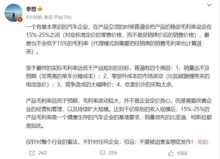 摆出一副老师上课姿态的李想,在这条微博末尾写到:“仅针对整个行业的看法,不针对任何企业,切忌:不要被迫害妄想症发作!”而这时,蔚来的财报电话会仍在继续中。