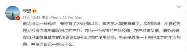 李想在微博上开启了反击:“最近出现一种观点,号称有了VR设备以后,车内就不需要屏幕了。”他还说,“不要轻易定义那些你连用都没用过的产品。”甚至略带指向性地说道:“在产品定义前,请务必确保自己掌握最基本的VR理论知识和足够的使用经验。不要轻易用概念误导消费者。”