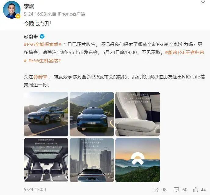 不久前的5月24日,是蔚来的大日子,肩负“走量任务”的全新ES6将举行上市发布会,公布售价并开启交付。而被戏称“忘记微博登陆密码”的蔚来创始人、CEO李斌,终于在这一天的下午4点发了一条微博:“今晚七点见!”