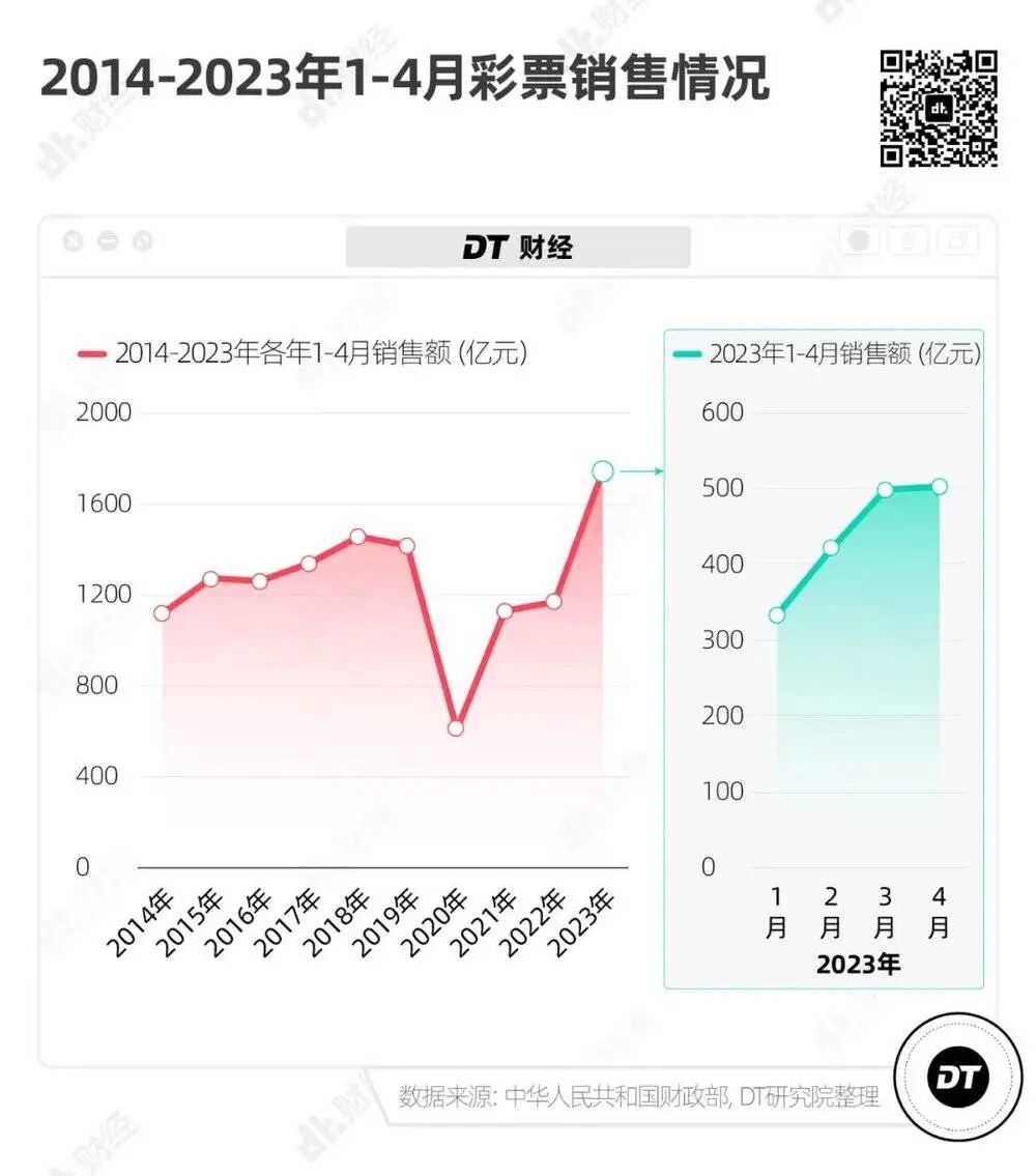 DT财经整理了从2014年到2023年1月~4月的彩票销售额,今年1~4月的彩票销售已经创了10年来的新高。而4月份单月的销售额,已经接近去年年底卡塔尔世界杯期间的单月销售(2022年12月受体育赛事影响,单月彩票销售额为608.49亿元)。