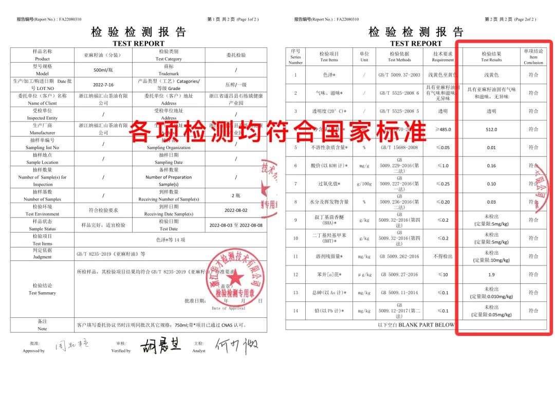 而这款冷榨亚麻籽油,不仅α-亚麻酸含量高,而且通过农残检测,,限量500瓶!