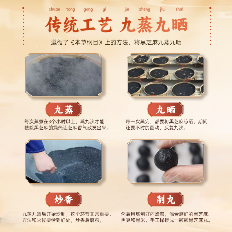 北京同仁堂采用九蒸九晒工艺,让芝麻的营养充分分解,油腻性大为减少,不上火,更易于人体吸收。