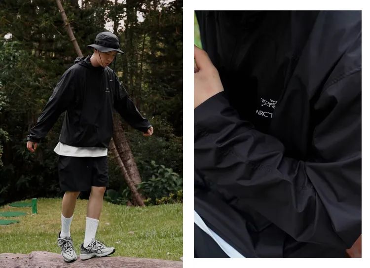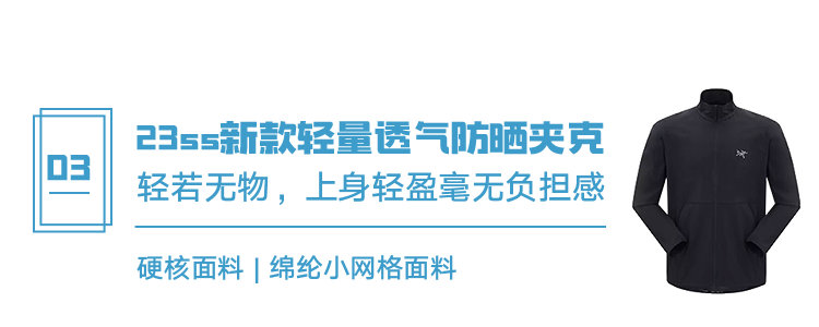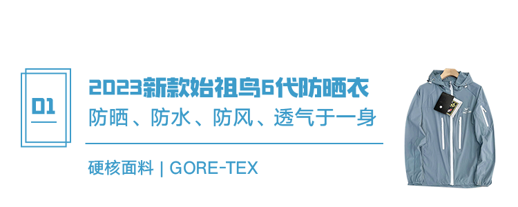 始祖鸟一跃成为大众向往的时尚「奢牌」,它家旗舰店甚至与爱*仕、蒂*尼比邻。在各大社交媒体,时尚达人、网红博主总是乐于晒出自己的“鸟标”,特别是这个夏天,一件标有鸟标的防晒衣,无论怎么穿搭都是好看的。而今天我们带来的三款始祖鸟防晒服,防晒值均达到UPF50+,而且各有各自的风采,款款都百搭好看有个性。很多穿搭博主说,一件始祖鸟防晒服上身,高级山系风就出来了。它撕掉户外穿搭的“严肃”、“硬核”标签,让普通人也能穿出时尚感。哪怕只是夏天的时候去公园遛狗、搭地铁上班,也能穿搭得时尚且清新舒适。最重要的是,有一件如此硬核的夏日战衣,就跟晒黑、晒得肤色不均说拜拜啦!这一款防晒衣,除了用冲锋衣的硬核面料 GORE-TEX外,连版型设计都有冲锋衣的感觉,上身效果超帅气,很难不爱。这种面料,三层叠加起来不到一件棉质T恤厚度,轻薄柔软,但丝毫不影响面料的防晒、防水、防风性能,还兼具透气性。连帽拉链设计,帽子带有帽檐部分,有调接扣,收紧后可包裹到额头下巴,防晒角度可谓是360度,还不怕被大风吹下去。衣服上有三个拉链,胸前两个拉链收纳袋,拉链带有防水功能,哪怕下雨天随身物件放里面也不怕渗水进去。有四色可选:黑色、白色、果绿、孔雀蓝;同样是男女同款,尺码涵盖S-3XL。这款Squamish连帽防晒皮肤衣在户外界久经考验,是夏日一件不可或缺的户外防晒皮肤衣。采用Tyono™ 30尼龙高强度防风面料,虽然轻薄但强度很大,防晒效果也是杠杠的。普通皮肤衣皮肤风衣一般由单层面料构成,没有防水薄膜,但始祖鸟这款采用DWR防泼水处理,足以在偶遇小雨或短暂涉水时,有效避免湿身。衣领处能将拉链拉到脖子以上,阳光无论何种角度照射,都能很好地防护脖颈处皮肤。皮肤衣配备可条件StormHood™兜帽,柔软帽檐可遮挡小雨,也可以当作防晒帽使用给予保护。衣服下摆有调接扣,调节腰身视觉,让你在搭配的时候更时尚。让人惊喜的是,胸口前的单侧胸袋,不仅可以外出时候存放小物件,还能当作皮肤衣的压缩后的收纳袋,小巧精致,随拿随用。有五色可选:黑色、橘色、天空蓝、荧光绿、豆沙绿;男女同款,尺码涵盖M-3XL。这款是2023年新款防晒夹克,设计简约,上身风格更随性。定制绵纶小网格面料,清爽透气不粘身,非常轻薄,内里全部包边工艺,半裸纹袖口,活动自如。隐藏式双拉链口袋,便携置物,下摆松紧弹力抽绳设计,可自由调节。面料上得印花,是先印再压花,不同角度折射不同效果,特别时髦。之前推始祖鸟速干T恤,就很多粉丝后台询问,什么时候能推冲锋衣。虽然夏天太热穿不上,但是抵不住鸟粉们的热情,我们买手硬是谈下三款特别火爆的明星款。而且还谈下相当大的优惠力度,连帽硬壳冲锋衣夹克外套(*雯同款),759元就给你拿下来,当作是给新老粉的反季特价福利啦。这一款可是刘雯身上黑金撞色始祖鸟,是ARC'TERYX × BEAMS联名限定款,李现、白敬亭就上身过同款外套,男女都可以完美驾驭。原本仅限日本地区发售,但是架不住中国粉丝的强大呼号力量,也在中国地区少量发售,很难找到现货。它由四个低调的大地色拼接而成,袖子处就清晰标注所用面料 GORE-TEX和BEAMS的刺绣字母logo。Dry-cuff压胶可调节袖口,可调节下摆便于造型,头盔风雪帽也很酷帅。最显眼的就是手臂和胸口处的金色始祖鸟logo,展露出来身价都高了不少。◎ 第六代SV 始祖鸟Arcteryx Alpha SV GTX 向导级四色硬壳冲锋衣◎ ARC'TERYX始祖鸟 BETA LT GORE-TEX 防水冲锋衣本店产品支持七天无理由退换