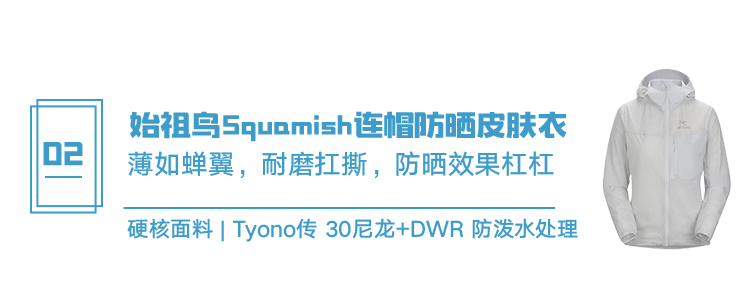 而且这三件防晒衣,可不是普通的防晒衣,用的都是始祖鸟用于制作高端线冲锋衣,有专利技术的面料——◎ 比如从美国W.L.Gore & Associates, Inc.(戈尔公司)购入,被誉为“世纪之布”的GORE-TEX面料,防水防风防晒的同时还很透气。◎ 还有超轻Tyono™ 30尼龙高度防风面料,经过DWR 防泼水处理,薄如蝉翼的同时,竟能阻挡强烈的紫外线,还能躲避小雨。