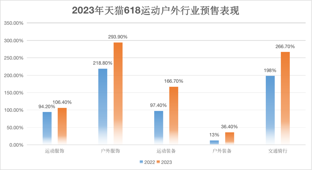 很长一段时间,户外运动在中国都是小众市场,但疫情令参与户外的普通人群迅速扩展。过去3年,露营、滑板、垂钓、轮滑、骑行、浆板、冲浪等新兴运动先后掀起热潮——它们在天猫618开卖首小时增长均超三位数。为了承接新的需求,天猫户外如今已有上百个品类并增加了很多新的叶子品类。去年一年,淘宝天猫平台上,仅露营一个叶子类目的销售规模就超过了百亿。根据天猫预估,未来3年内,户外各叶子的类目的零售规模能够达到500亿左右。由于消费人群泛化、场景逐渐增多,户外服饰和装备正成为一种日常穿搭,开始与时尚结合。过去,功能性是户外鞋服的唯一诉求,出于标准化和专业性的考虑,户外鞋服和装备几乎都是统一的黑白灰棕,各大品牌的款式也都保持一致。如今,户外装备产品变得鲜艳亮眼、设计也更多元。从预售表现来看,主动拥抱泛户外人群的北面、蕉下、蕉内、始祖鸟、Ohsunny等都进入此次天猫618预售榜的前十。![]()