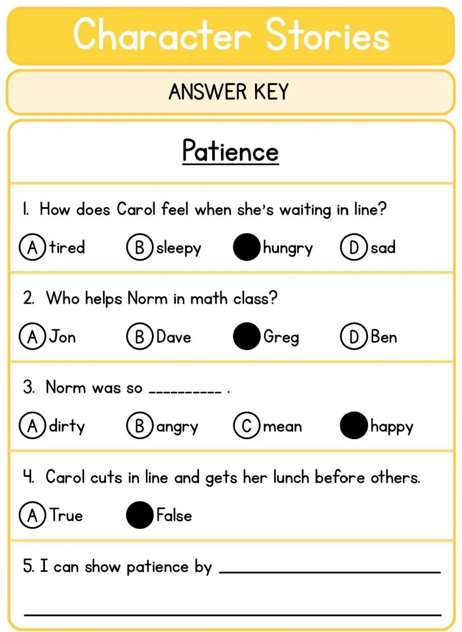 第一题,问当carol等待的时候,她感觉怎么样?答案中四个单词,考察的是孩子的词汇量。
