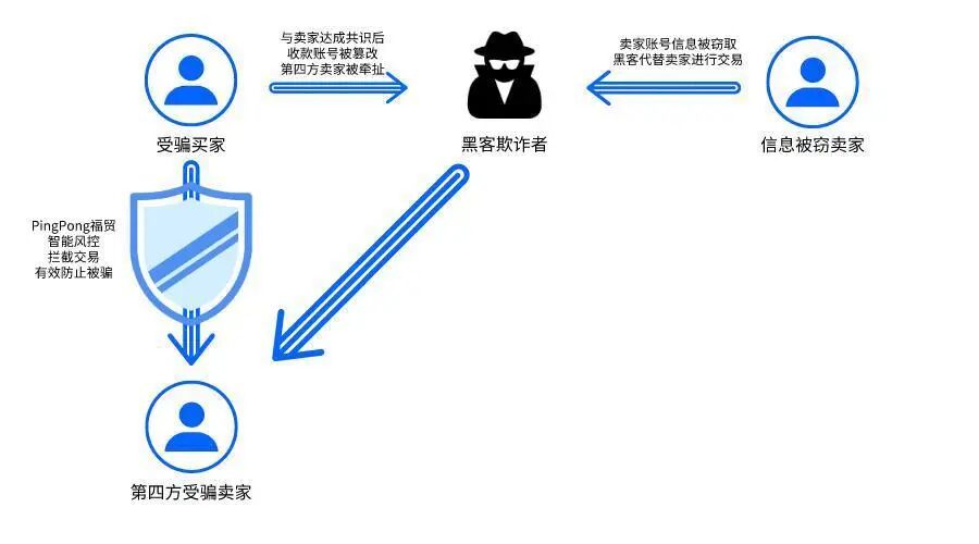 根据事后追溯,买家在某平台与卖家确认了外贸订单,在打款之前,黑客欺诈者盗取了卖家的邮箱账户信息,伪装成卖家与买家交流打款的详细事宜,顺理成章地将收款方改为由黑客欺诈者自己联系的第四方卖家。第四方卖家的 PingPong 福贸账户收到了买家打款,风控智能系统立刻监测到风险信息,将此笔交易列为风险交易,并对卖家进行提醒。