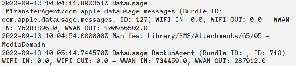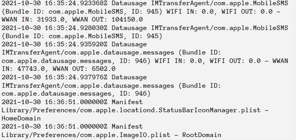 研究人员发现的唯一最可靠的指标是提到名为“BackupAgent”的进程的数据使用行。这是一个废弃的二进制文件,在正常使用设备期间该文件不应出现在时间轴中。然而,需要注意的是,还有一个名为“BackupAgent2”的二进制文件,这并不是一个攻击指标。