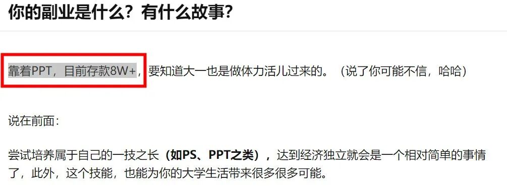 比如知乎上这篇关于「副业」的回答,直接惊到我:一个大三学生,只靠 PPT 副业就赚够了 8W+。