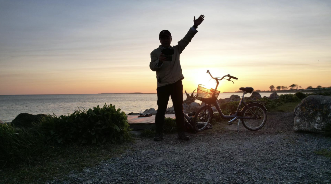 来丹麦老睡不好,最初几天是因为时差,后来是因为心里老惦记着天气如何——其实是惦记着拍照,所以老睡不踏实。每天很早就醒了。今天也是四点过一点就醒来,掀起窗帘看天空,哇,还没完全亮的天空已经被染红,这是一个难得的好天气。看时间,是四点四十,再看手机上的天气预报APP,欧登塞的日出时间是五点十分。马上骑车出发。一路上的农舍、树林、输电线……都在晨曦中成为剪影。好些时候我很想刹住车然后拍拍照,但我提醒自己要抢在日出前到达海边。![]()