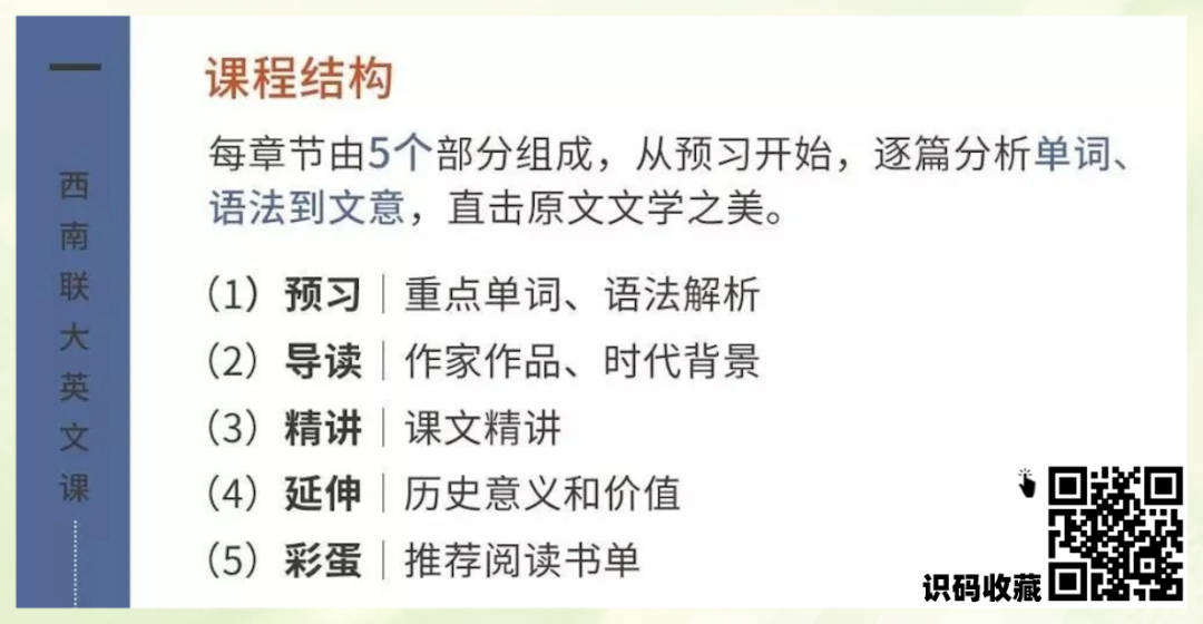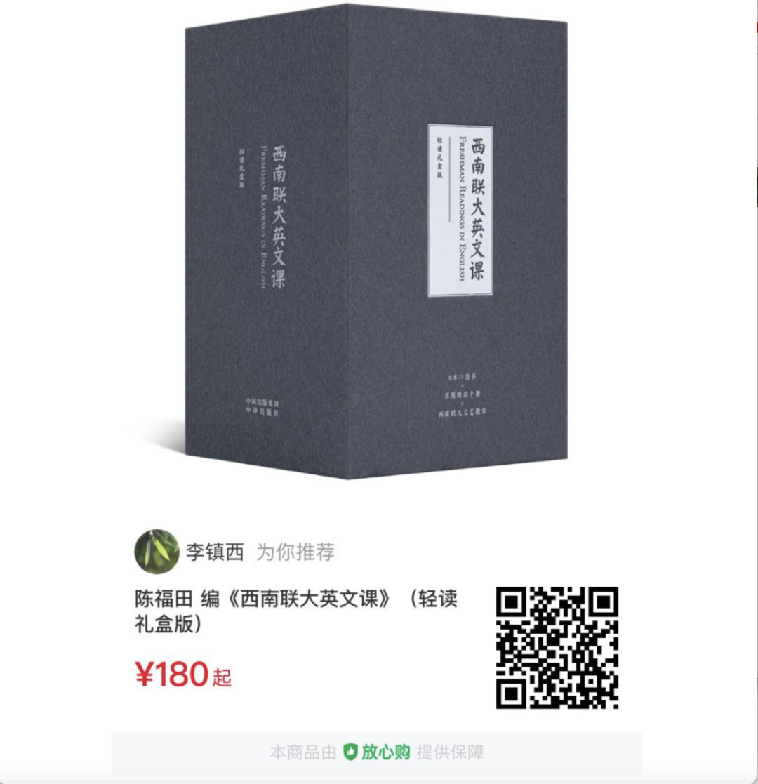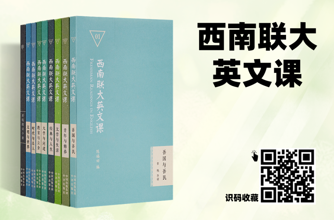 在这套《西南联大英文课》,集结了来自清华、北大、人大、北外、上外、华师大6所名校的著名英语教授,以当代视角演绎和致敬当年西南联大英语精读课堂,帮助你跳出表层阅读,洞悉文学与文化的奥秘。在这里,你会发现《月亮与六便士》的作者毛姆,原来写过《哲学家》这样的叙事短文,在“哲学家”辜鸿铭面前,一贯叛逆的毛姆居然也有了恭敬而认真的一面;你还会发现写出《瓦尔登湖》的隐者梭罗,在《红蚂蚁大战黑蚂蚁》这篇隽永的小文里,谈论残酷战争与社会现实的时候,竟然如此地犀利而深刻;除了8位名师对9篇精选课文的讲解音频,本课程还附赠600分钟原文朗读。由艾美奖获奖得主、美国著名录音演员将原版43篇课文的英文进行录制,带给你原汁原味的地道发音。在这堂穿越了80余年的西南联大英文课里,你可以随时随地一边品读书中文章,一边戴上耳机听老师的细致解读,把西南联大英文课的灵魂,深深镌刻入心。“刚毅坚卓”的联大校训,都浓缩在了小小的一枚民国文艺的联大徽章之中。小小的徽章,仅是其中的紫色部分,就经过多次调色,三次打样,最终选取与联大校徽的紫色最接近又最为高级的色调,旨在奉献给读者最有意义的一份情怀之礼。怀着对大师、先辈的致敬,先知书店诚挚推荐这套《西南联大英文课》(轻读礼盒版)。英语是全世界最通用的语言,学习英语究竟有多重要无需多言。对于个人而言更关键的是学习英语的途径和方法。而这套中国最好的大学的英文教材,备受老一辈文人的赞誉,经过了时间的检验,复刻升级版的《西南联大英文课》质量有增无减,值得所有有志于提高英语水平的读者收藏、学习。长按下图,识别图中的二维码,即可一键收藏:![]()