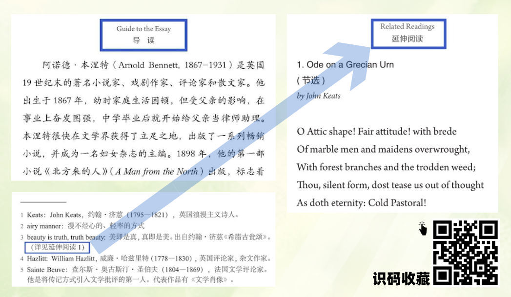 8本口袋本的小巧设计以及高级配色,不仅颜值高、便于携带,也很值得收藏了!不仅如此,除了包含原书43篇课文的8册口袋本,还有一本玄青色“精读手册”。这是西南联大陈福田教授当年为联大新生编写的生难词释义和课后思考题合辑,满足部分读者“死磕”英文的需求。当然,哈佛毕业的陈福田教授所作的英文版Notes可不只是简单的释义:英语专业的同学都知道——“好的词典不是汉英词典,而是英英词典”。因为用英语解释英语,能让我们避免字对字的翻译和理解,更好地了解词汇和短语的含义。陈福田教授不仅为课文中的生词难词做了注解,也结合文本,进一步地讲解并提出了值得深入思考的问题。◎50节名师精读讲解音频,600分钟的原文音频:穿越历史,共赴一场听觉盛宴